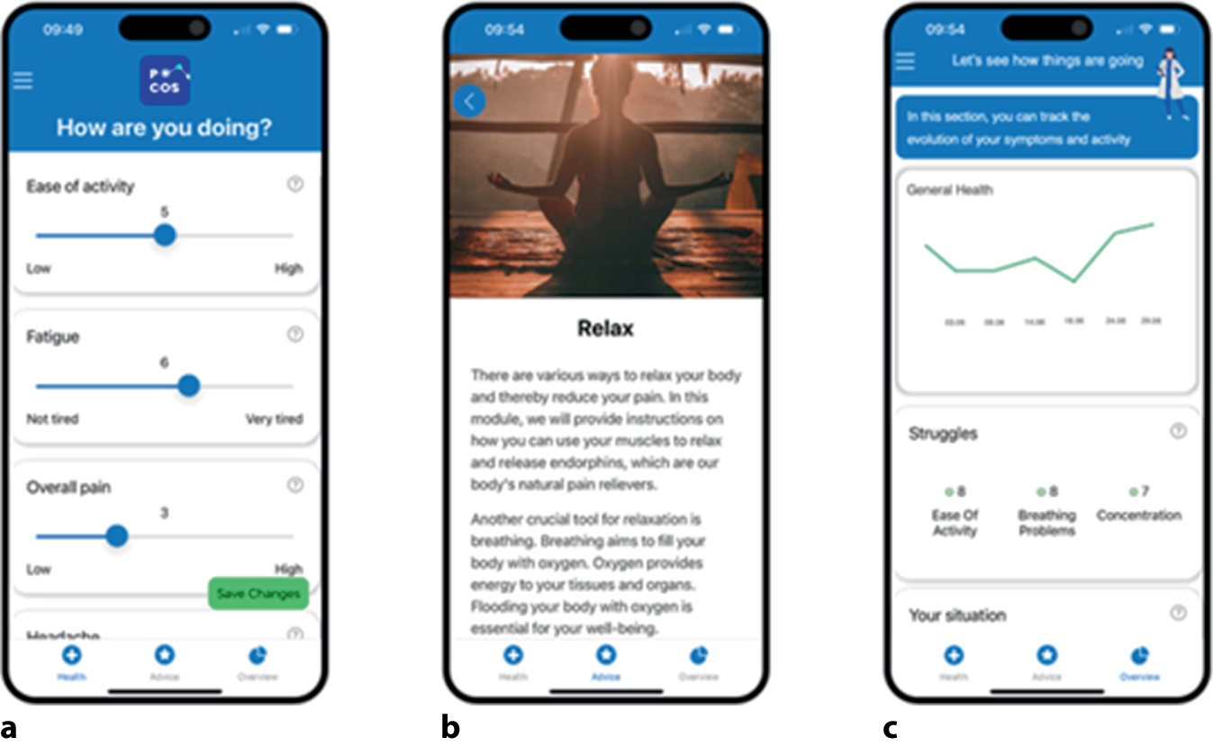 Exemplarische Fibromyalgie-App POCOS (Pain Organiser and Companion System) für Patient:innen mit Fibromyalgie, wie sie in der User-Experience-Studie eingesetzt wurde. Navigation über Leiste unten zur Symptomeingabe (a), Online-Therapieprogramm (b) und Verlaufsdarstellung (c)