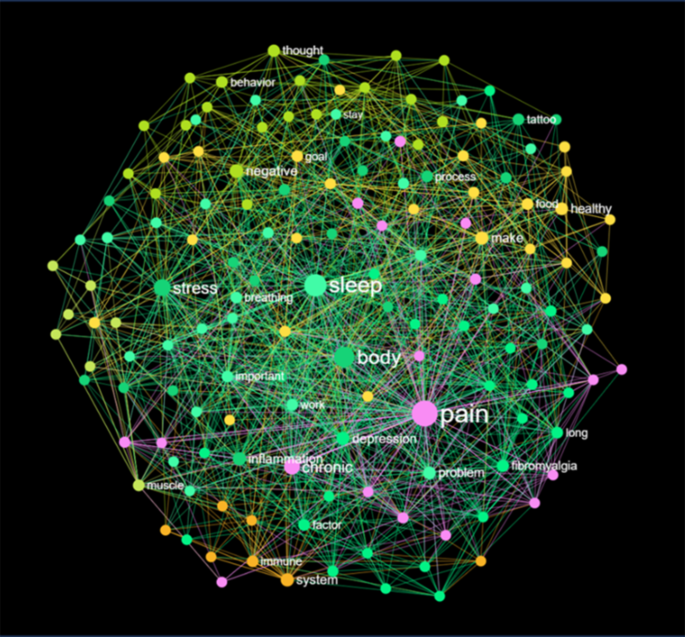 Die Inhalte der in Tab. 1 aufgeführten Fibromyalgieprogramme sind meist nicht oder nur sehr eingeschränkt veröffentlicht. In der Regel werden lediglich die Hauptmethode, wie bei Stanza die Akzeptanz- und Commitment-Therapie, sowie die Programmdauer angegeben. Dies erschwert den Vergleich einzelner Programme und deren Anpassung an spezifische Patientengruppen. Dies könnte z. B. mithilfe von Knowledge-Graphen wie hier für POCOS (Nodus Labs) dargestellt werden (Abb. 2). Durch den Einsatz solcher Large-Language-Model(LLM)-unterstützten Knowledge-Graphen lassen sich Inhalte von Schmerzprogrammen nicht nur visualisieren und transparenter gestalten, sondern auch gezielte Gap-Analysen durchführen und inhaltliche Verbesserungen ableiten.