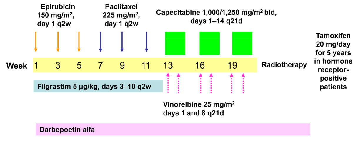 The starting doses were selected because these or higher doses had demonstrated good tolerability in previous studies in the metastatic setting [11, 12]. All patients received darbepoetin alfa from day 1 of chemotherapy until the end of radiotherapy (starting dose of 300 μg weekly for 4 weeks, after this every 3 weeks). Patients with hormone receptor-positive disease received tamoxifen 20 mg/day for 5 years after completion of chemotherapy.