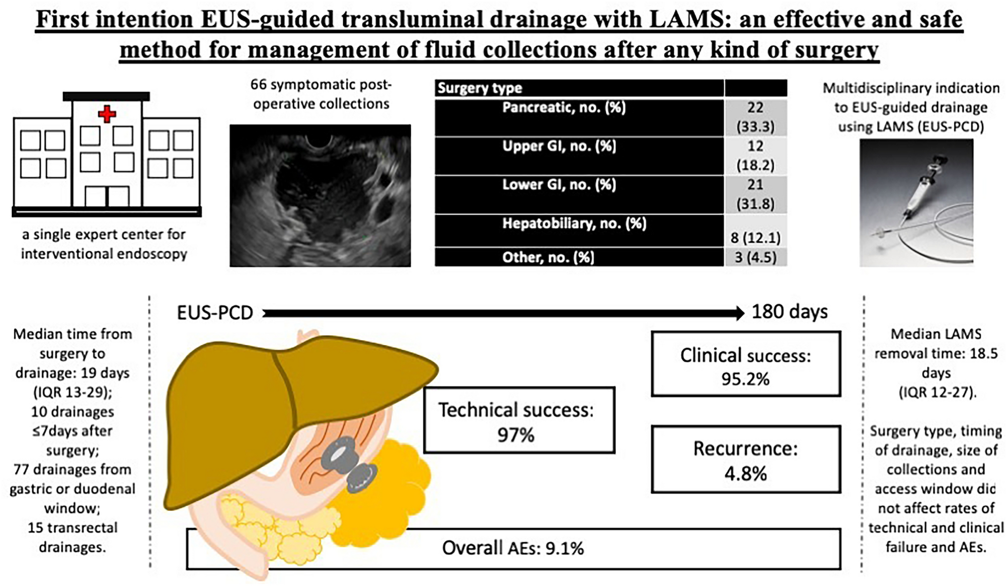 - First-intention EUS-guided transluminal drainage with LAMS: an effective and safe method for management of fluid collections after any kind of surgery
