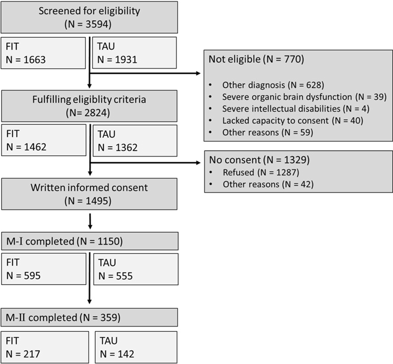 FIT (N = 595) | TAU (N = 555) | p | FIT (N = 217) | TAU (N = 142) | p | ||