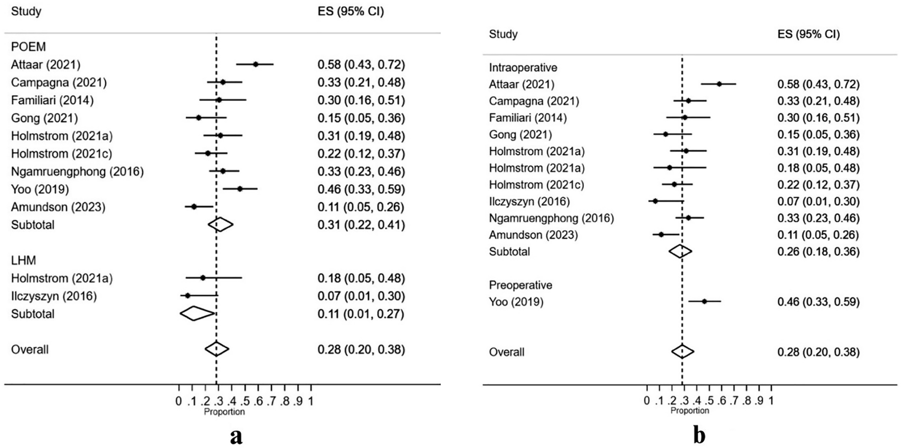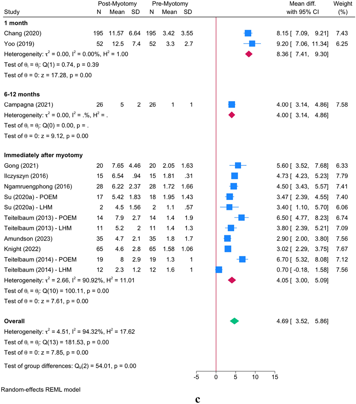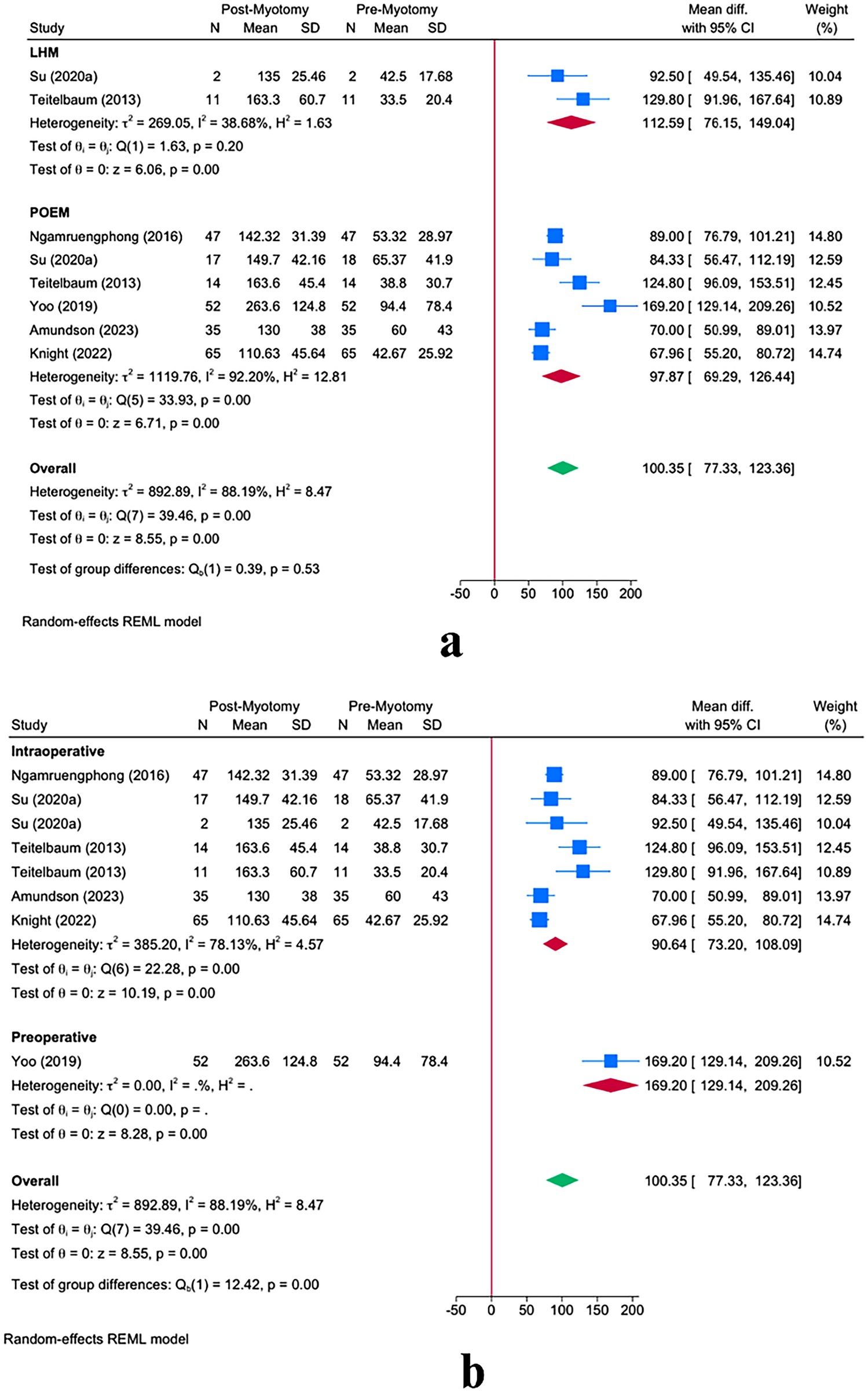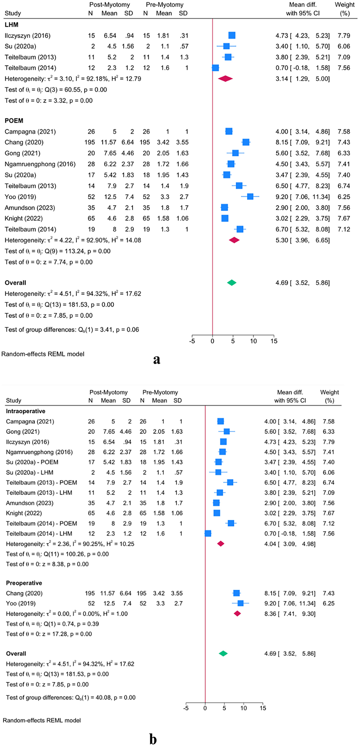 However, in terms of clinical outcomes, our results indicate a significant effect-modifying role of the type of surgery on achalasia patients’ Eckardt score and the rate of reflux esophagitis following myotomy. This effect could be explained by multiple factors. First, POEM is associated with a lower degree of pain compared to LHM [