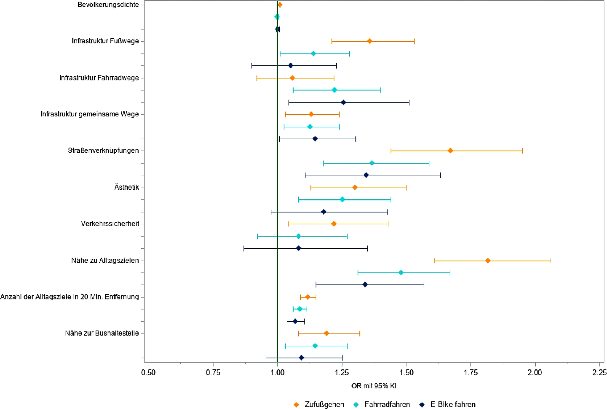 Mehrere Wohnumweltfaktoren waren mit aktiver Mobilität im Alter assoziiert [21, 22]. Dies betrifft vor allem die Nähe von Alltagszielen, ein dichtes Straßennetz/gute Wegeverbindungen und eine gute Fußwege- und Fahrradinfrastruktur. Die Assoziation des E‑Bike/Pedelec-Fahrens mit Wohnumweltfaktoren war etwas geringer im Vergleich zu Radfahren (alle Radtypen) oder Zufußgehen (Abb. 2).
