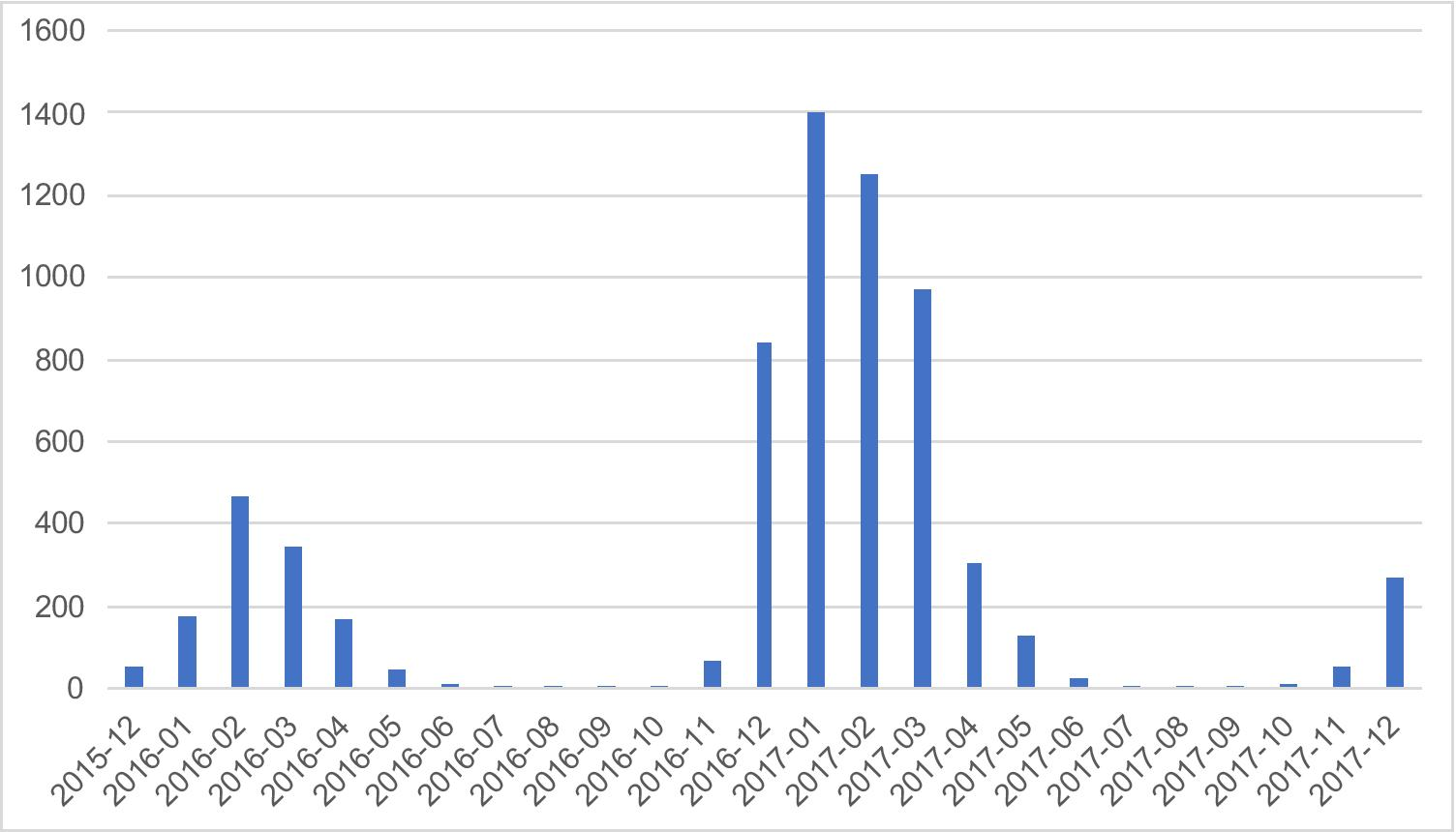 Number of patients with influenza admitted per month. Distribution of baseline month for the influenza patients