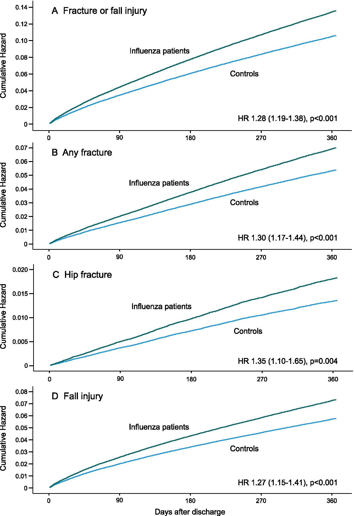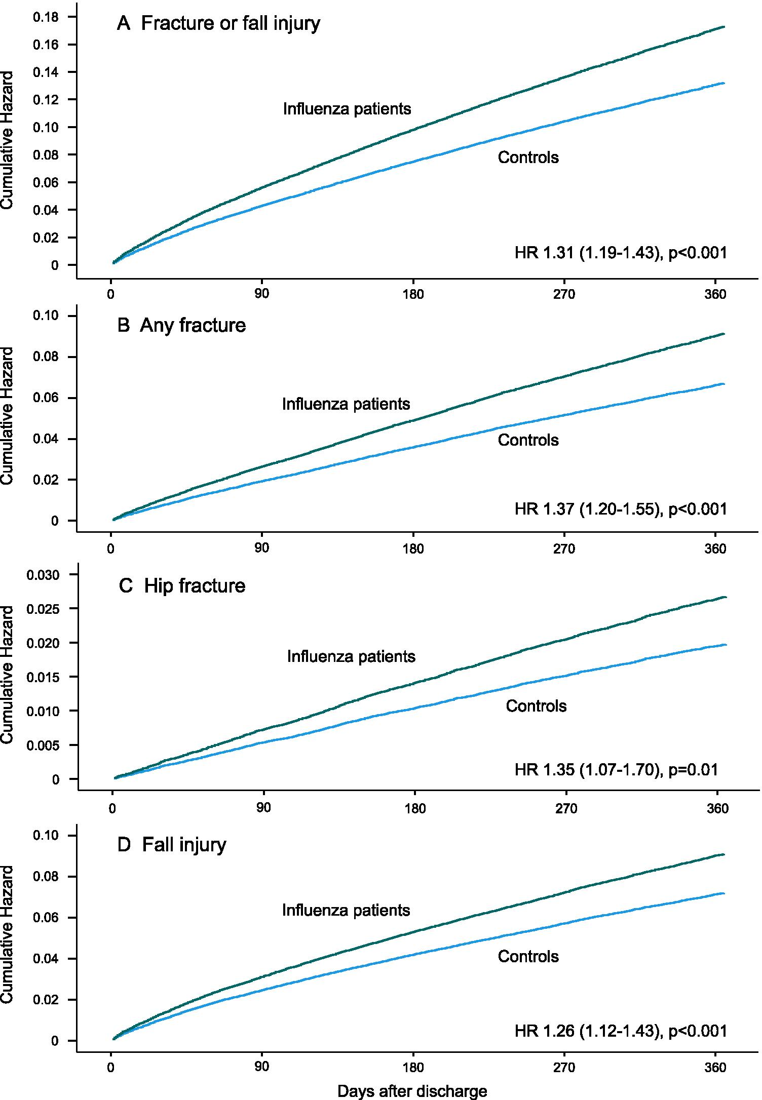 In conclusion, an increased risk of fractures and fall injuries was observed in influenza patients after discharge from hospital, in comparison to age- and sex-matched controls admitted for other reasons.