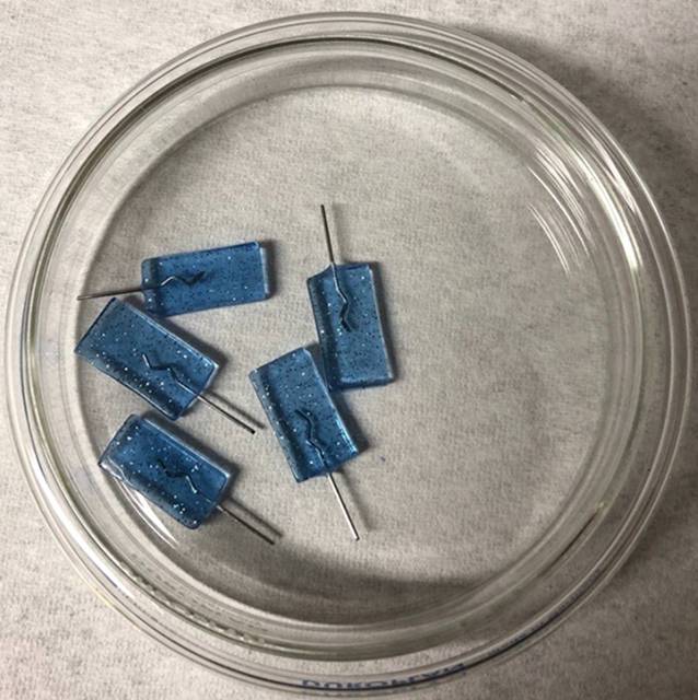 5 Stücke jedes Drahttyps wurden nach den Anweisungen des Herstellers in einen kieferorthopädischen Kunststoff eingebettet. Dieser wurde zuvor teilweise eingefärbt oder mit Glitzer versehen, sodass 4 verschiedene Varianten vorlagen: transparent, transparent/Glitzer, blau und blau/Glitzer (Orthocryl® und Orthocryl ®Disco-Glimmer, Dentaurum, Ispringen, Deutschland). Es wurden rechteckige Silikonschablonen mit der Größe von 10 × 2,75 × 20 mm verwendet, um reproduzierbare Abmessungen für alle Prüfkörper zu erreichen. Jeder Prüfkörper hatte eine Gesamtfläche von 5,65 cm2.