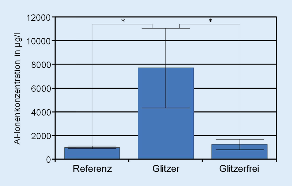 Mittlere Konzentration und Standardabweichung der Aluminiumionen, die in der Referenzlösung und im Korrosionsmedium mit den glitzerhaltigen und nicht glitzernden Prüfkörpern nach einer Woche Immersion nachgewiesen wurden. (Sternchen signifikante Erhöhung)