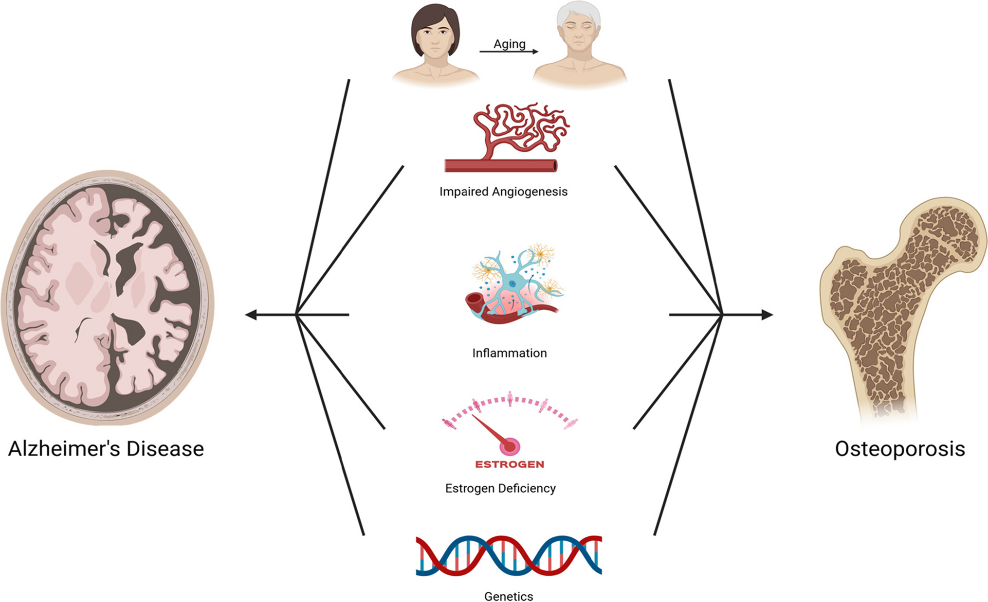 Factors such as aging, impairment of angiogenesis, inflammation, estrogen deficiency, and genetics can contribute to the pathogenesis of both Alzheimer’s disease and osteoporosis