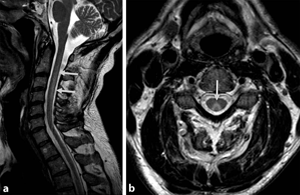 T2-gewichtete zervikale MRT. a Sagittale, b axiale MRT mit V‑förmigen Hyperintensitäten der Hinterstränge (Pfeile)