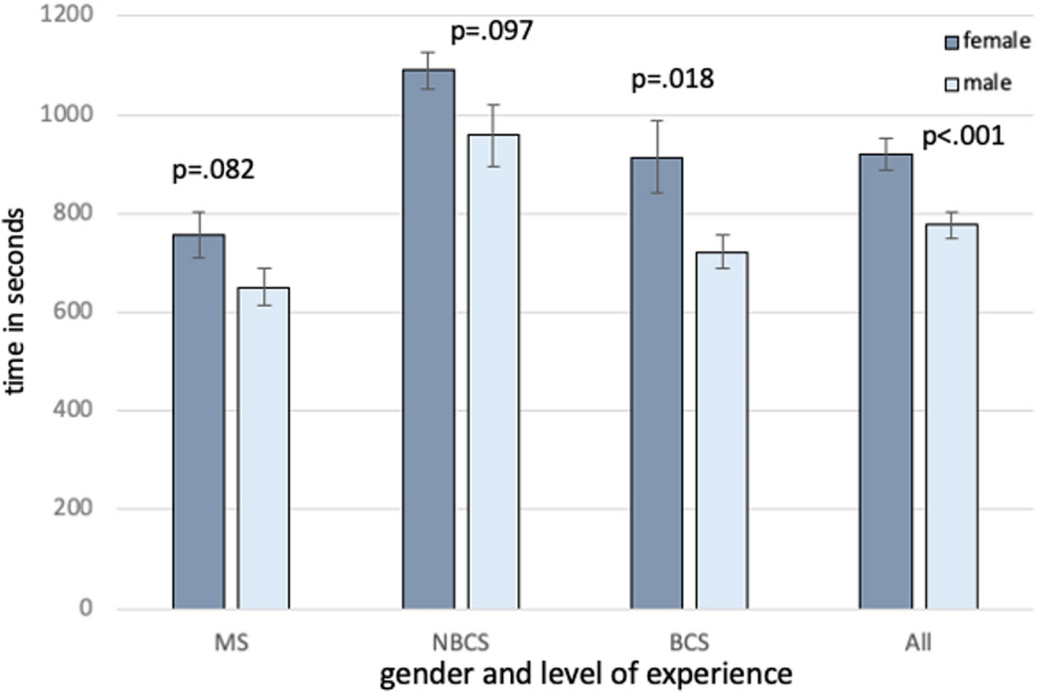 n), mean ± standard deviation, qualitative variables by absolute and relative frequencies (percentages). Outcome measures are evaluated by linear mixed models for repeated measures (MMRM) with main effects experience, sequence, method, repetition, and interactions (type III SS, REML, heterogeneous compound symmetry covariance matrix). Estimated marginal means and contrasts were derived. To ensure convergence of algorithms and to get readily interpretable results, separate models were fitted by gender and the obtained marginal means and contrasts were compared based on reported standard errors and degrees of freedom. Two-sided p values < 0.05 were interpreted to indicate statistical significance. Statistical data analysis was performed using SPSS Statistics 26 (IBM Corp., Armonk, NY, USA).