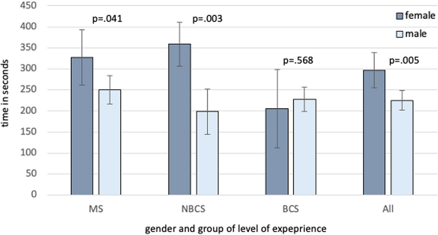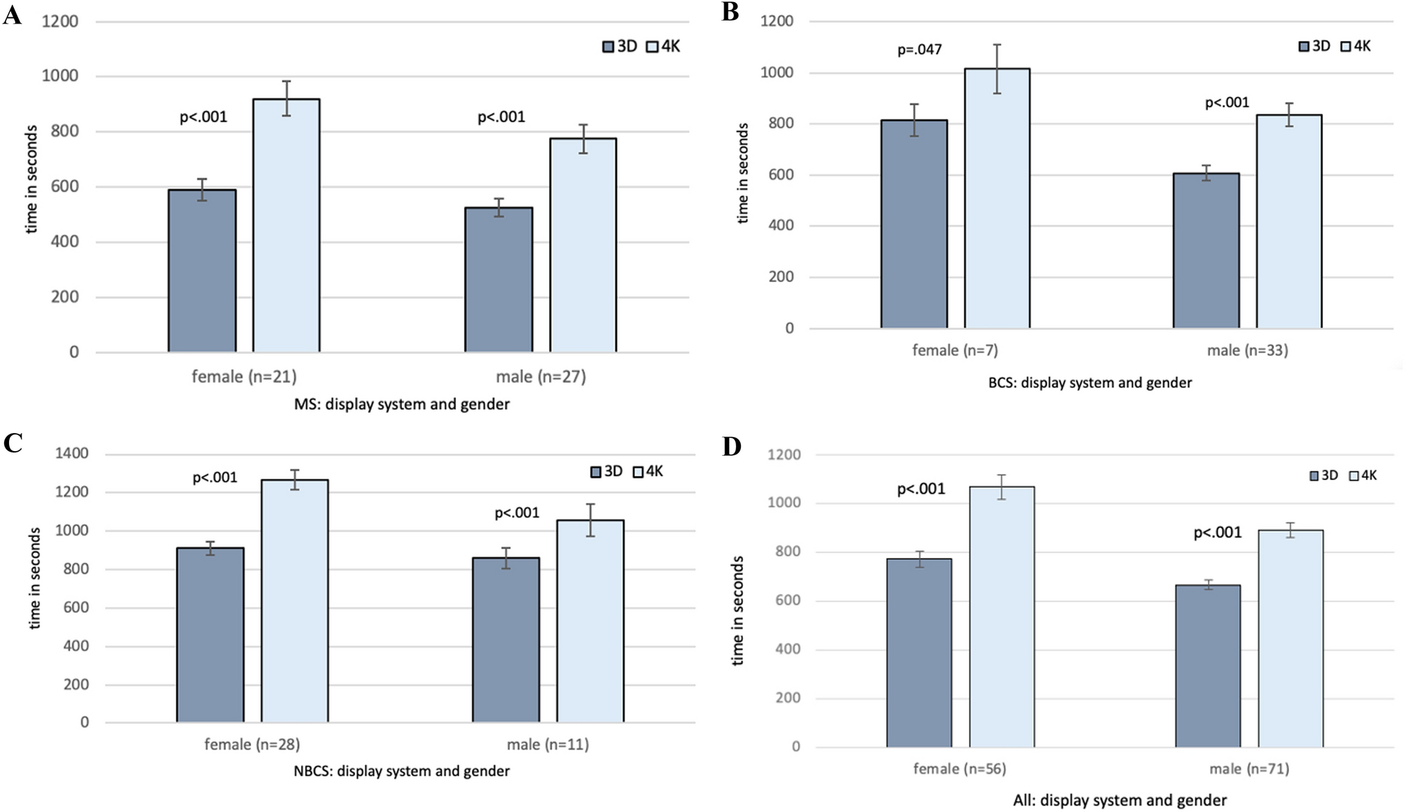 This not only proves that both genders benefit from 3D, but also shows that the effect is more pronounced in female surgeons. This is most evident in surgically unexperienced groups of MS, with women performing 327.6 s faster by using a 3D-vision system (35.8%) compared to 249.8 s (32.12%) in men (p = 0.041) and NBCS women improved by 359 s (28.25%) vs. 198.2 s (18.62%) in men (p = 0.0003).