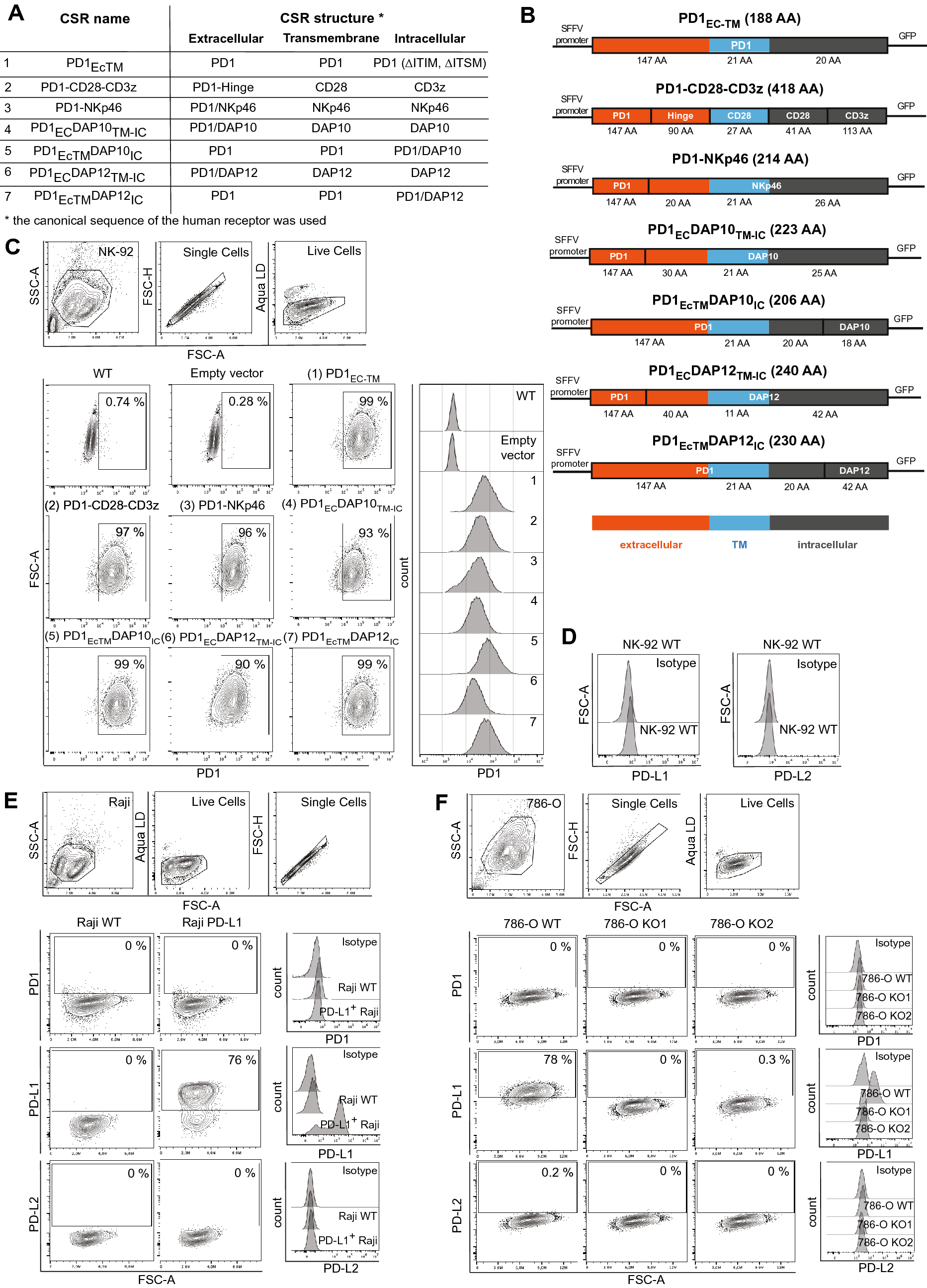 PD1-based chimeric switch receptors are stably expressed in NK-92 cells. A, B Table and vector maps depicting the design of the truncated PD1 receptor (PD1EcTM) and six chimeric switch receptors (CSR) with different signaling domains C NK-92 cells containing different PD1-CSR and sorted for positive PD1 surface staining. D PD-L1 and PD-L2 expression on NK-92 cells. E PD1, PD-L1 and PD-L2 expression on PD-L1+ Raji and PD-L1− Raji WT cells. F PD1, PD-L1 and PD-L2 expression on PD-L1+ 786-O WT and PD-L1− 786-O KO cells