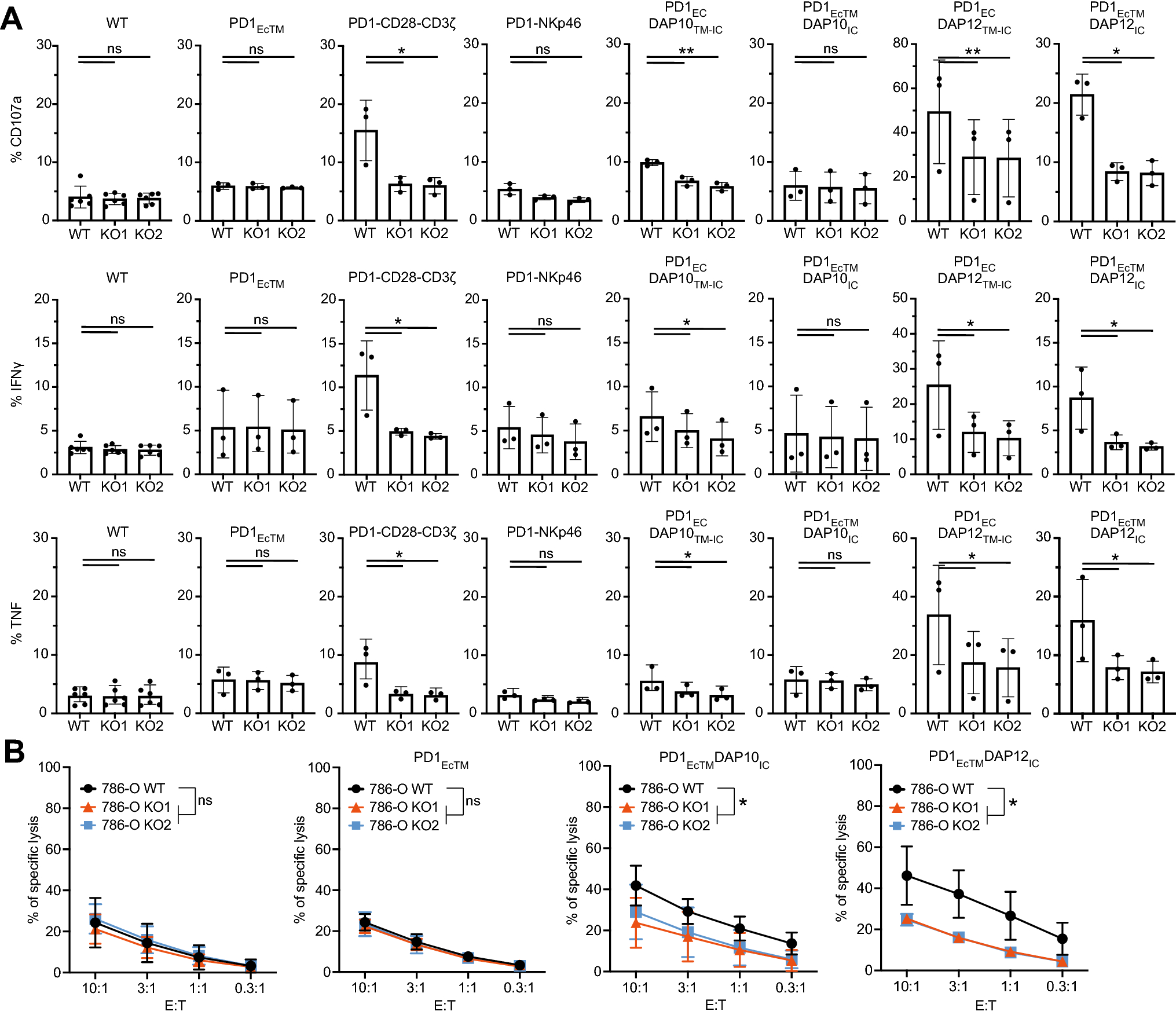 To extend these results, degranulation and cytokine expression of PD1-CSR+ pNK cells was also measured against PD-L1+ 786-O WT and PD-L1− 786-O KO cells (Figure S8D–F). Similar to the data from NK92 cell lines, WT or mock-transduced pNK cells showed a low expression of CD107a, IFNγ and TNF against both PD-L1+ 786-O WT and PD-L1− 786-O KO cells, with no significant differences between the target cell lines. Compared to that PD1bright PD1EcTMDAP12IC+ pNK cells, but not PD1dim PD1EcTMDAP12IC+ pNK cells, significantly increased CD107a, IFNγ and TNF expression against PD-L1+ 786-O WT cells compared to PD-L1− 786-O KO cells. While PD1EcTM+ and PD1EcTMDAP10IC+ pNK cells did not correlate with a higher CD107a expression, they showed a higher IFNγ and TNF expression against both PD-L1+ 786-O WT and PD-L1− 786-O KO cells. All in all, PD1bright PD1EcTMDAP12IC+ pNK cells increased degranulation and cytokine expression against PD-L1+ 786-O WT cells.