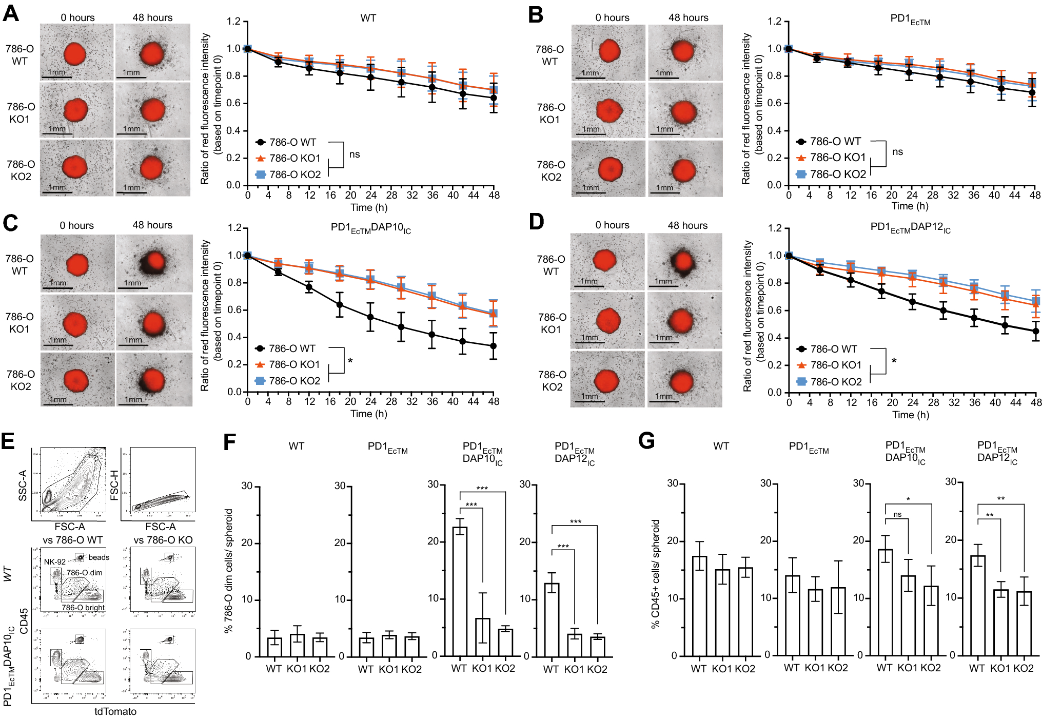 PD1-CSR+ NK-92 cells increase cytotoxicity against PD-L1+ tumor spheroids. A–D Killing of PD-L1+ 786-O WT versus PD-L1− 786-O KO1 and PD-L1− 786-O KO2 tumor spheroids by NK-92 WT, PD1EcTM+, PD1EcTMDAP10IC+ or PD1EcTMDAP12IC+ NK-92 cells. Each data point represents the mean (± SD) of six independent experiments performed in duplicates. E–G Tumor spheroids were collected, washed, dissociated and analyzed by flow cytometry. Displayed is the gating strategy (E), the percentage of 786-Odim cells per spheroid (F) and percentage of CD45+ NK-92 cells per spheroid (G). Each data point represents the mean (± SD) of three independent experiments performed in duplicates. Statistical significance (* p < 0.05; ** p < 0.01; *** p < 0.001) was determined with a two-way ANOVA test