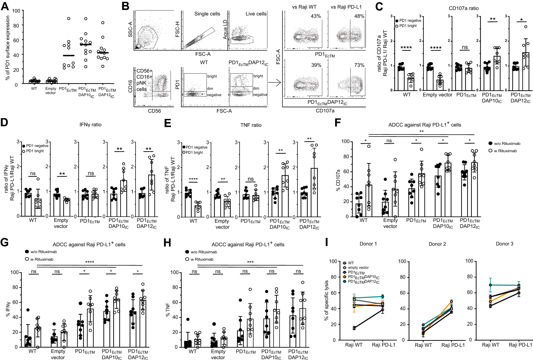 PD1EcTMDAP10IC+ and PD1EcTMDAP12IC+ pNK cells increase degranulation and cytokine expression against PD-L1+ Raji cells together with ADCC