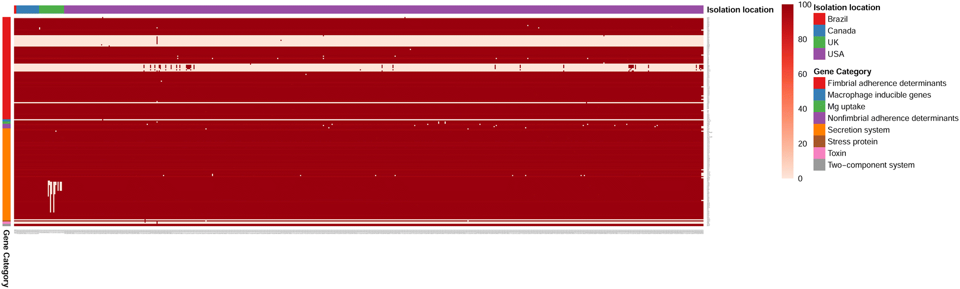 Mapping of virulence determinants in S. Heidelberg. Heat map showing virulence factors identified in Salmonella ser. Heidelberg strains under this study. X axis represents sample name based on geographical origin of isolates. Y axis represents virulence gene names. Categories of virulence factors were grouped in to 5 groups. Group legend: 1. Fimbrial adherence determinants, 2. Macrophage inducible genes, Mg Uptake, and Non Fimbrial adherence determinants, 3. Secretion system, 4. Stress protein, Toxin, Two component system. A detailed description of predicted virulence data is available in Additional file 2: Table S2A, B. Color bar represents percentage sequence identity