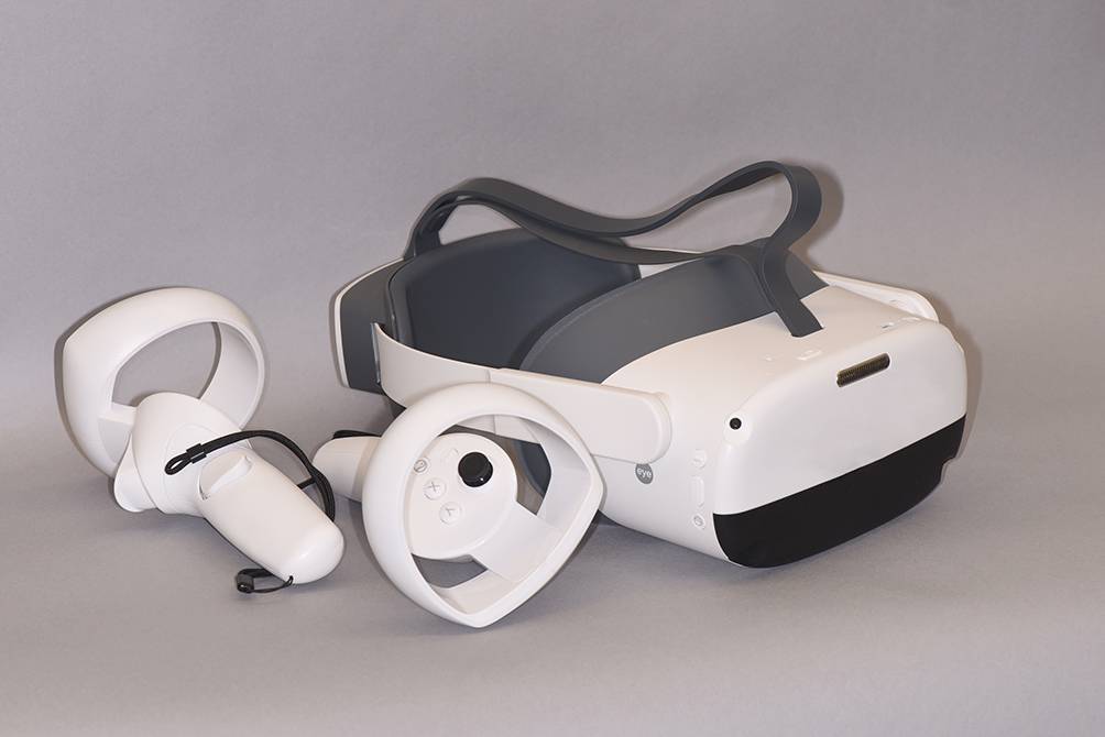 Beispiel für ein „virtual reality headset“/VR-Brille zur Durchführung einer perimetrischen Untersuchung mit den dazugehörigen Handstücken