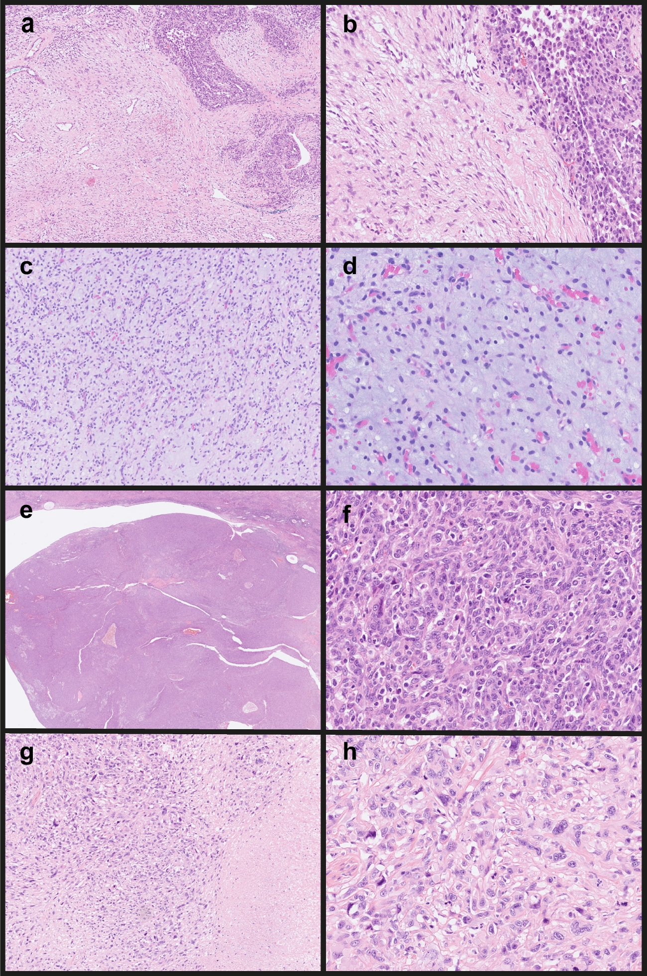 Morphological features (H&E stain). a and b, Case 2: A biphasic pattern consisting of nests and sheets of epithelioid cells transitioning into a spindle cell component (as seen in gastroblastomas) was present (× 10 and × 32 magnification). c and d, Case 3: Similarities with myxoid liposarcoma comprised of primitive round and spindle cells set in a myxoid stroma were seen. Note the delicate chickenwire-like vasculature (× 8 and × 20 magnification). e and f, Case 4: The endometrial neoplasm had a polypoid appearance and consisted of epithelioid cells arranged in sheets and nests (× 1 and × 25 magnification). g and h, Case 8: Polymorphic epithelioid tumor cells were mainly arranged in sheets. There was brisk mitotic activity (h). Tumor necrosis was present (on the right in g) (× 8 and × 20 magnification)