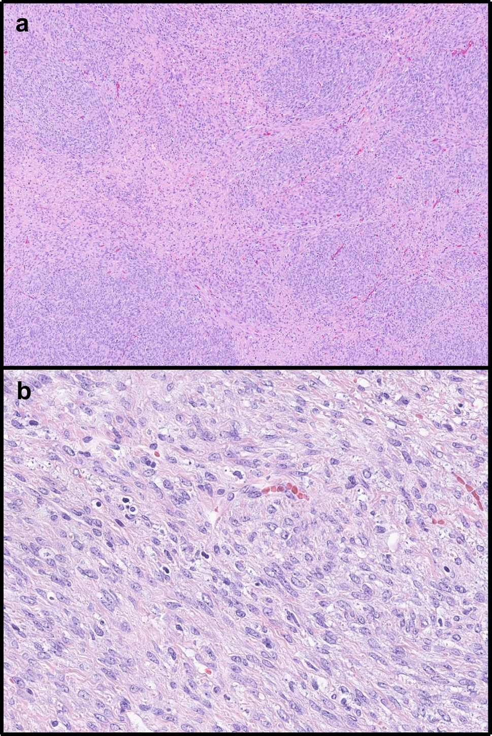 Morphological features of Case 6 (H&E stain), a and b: A multinodular proliferation of monomorphous spindle cells arranged in vague bundles was identified in Case 6 harboring a PTCH1 mutation (× 8 and × 25 magnification)