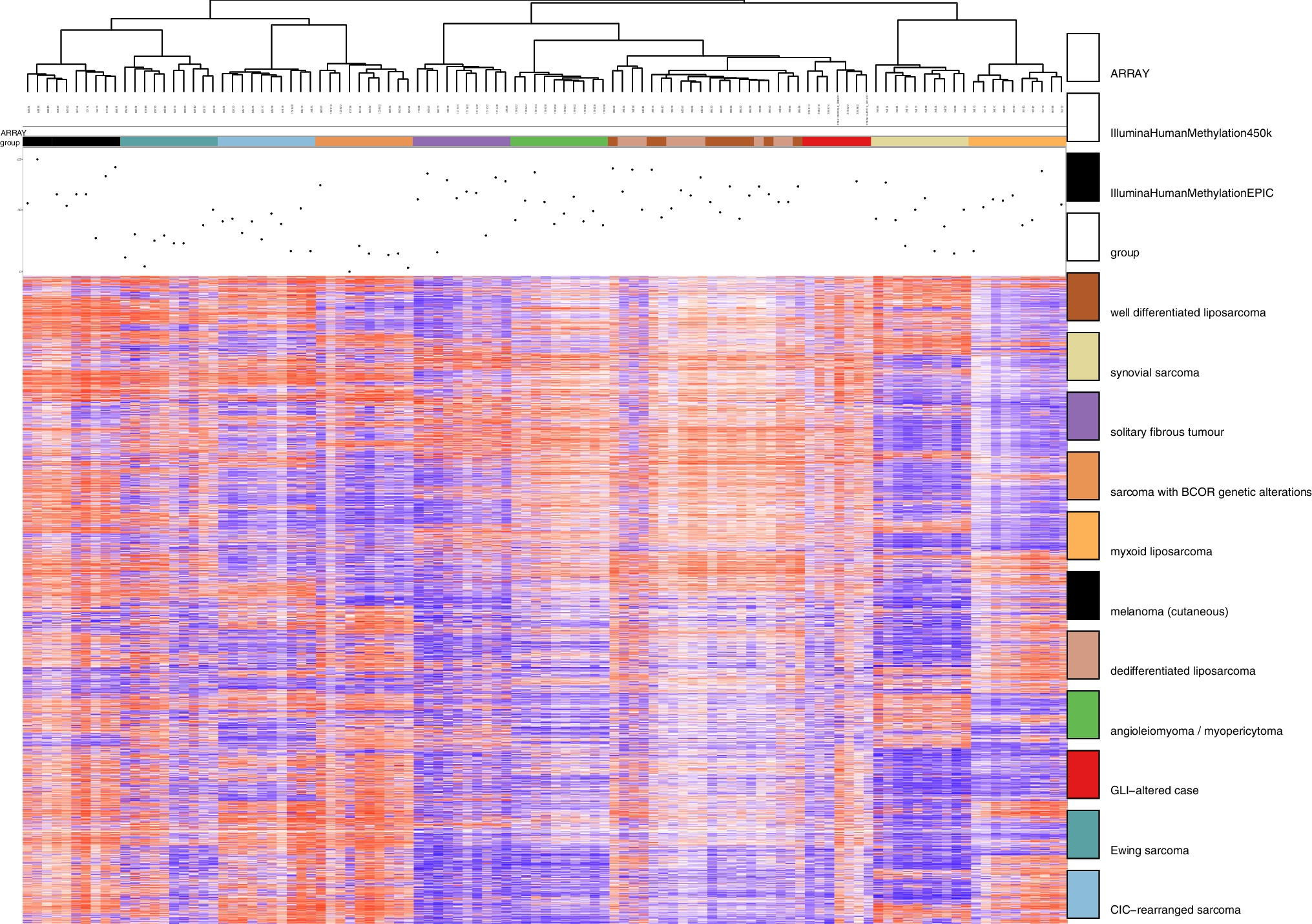 DNA was isolated by NorDiag Arrow using the DiaSorin DNA extraction kit (NL) or GeneRead DNA FFPE Kit (Qiagen) according to the respective manufacturer’s instructions. DNA concentration was measured using the Qubit 2.0 fluorometer. Per sample, we used 500 ng (DK) or 200 ng (NL) of DNA. Bisulphite conversion was performed with EZ DNA Methylation™ Kit (Zymo Research, Irvine, CA, USA). All methylation data were generated using the Illumina® MethylationEPIC (850 k) BeadChip platform as previously described [25]. Classification of the samples was performed by the Heidelberg sarcoma classifier using the most recent version available, v12.2 [26]. DNA methylation data were processed using a modified version of the minfi package [27], and computational analyses were performed employing R version 4.6.1 (https://www.R-project.org).