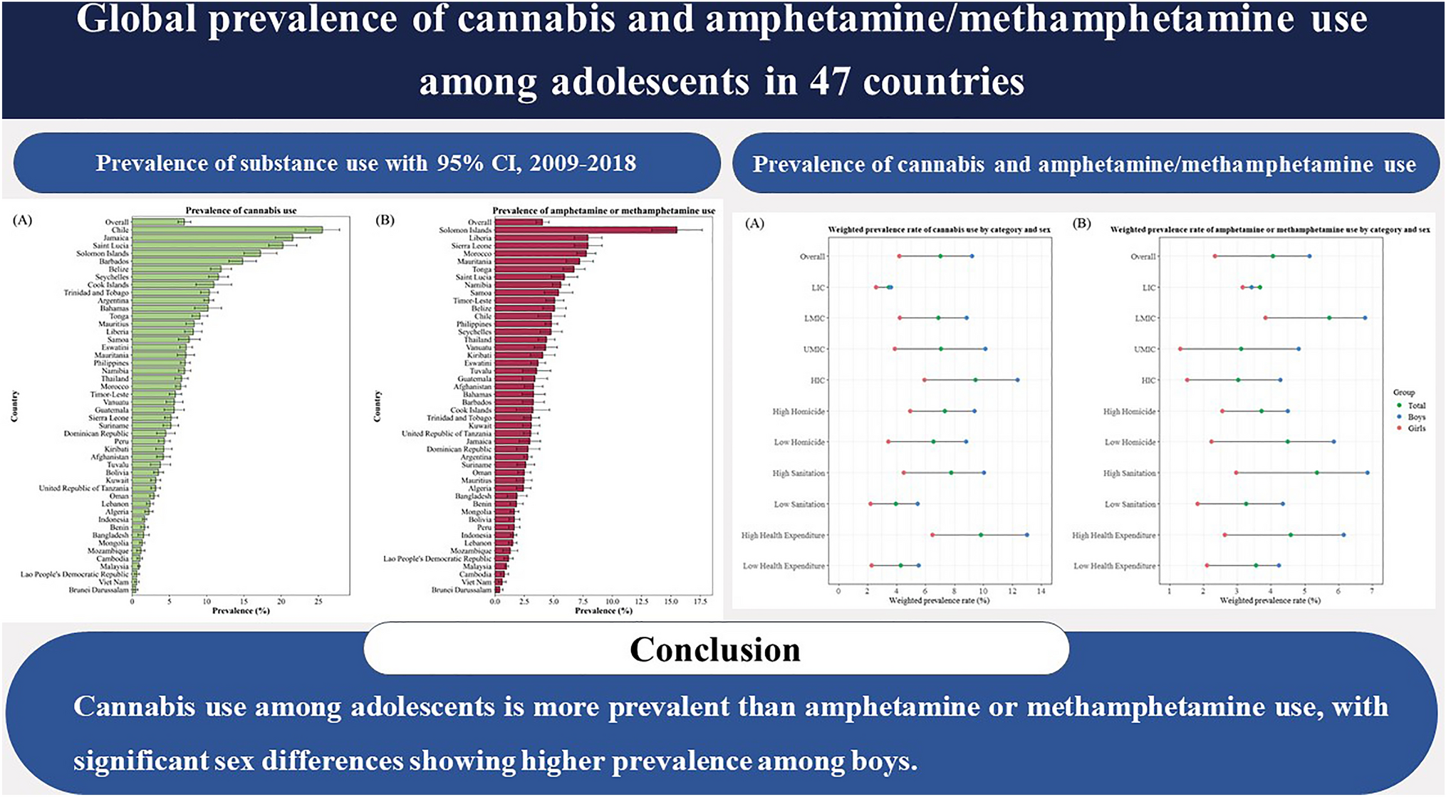 Cannabis use among adolescents is more prevalent than amphetamine or methamphetamine use, with significant sex differences showing higher prevalence among boys. The highest prevalence of cannabis use was observed in Latin America, while Africa exhibited the highest rates of amphetamine use. Findings from the present study indicate a need for public policies and programs targeting adolescents to effectively reduce adolescent drug use.