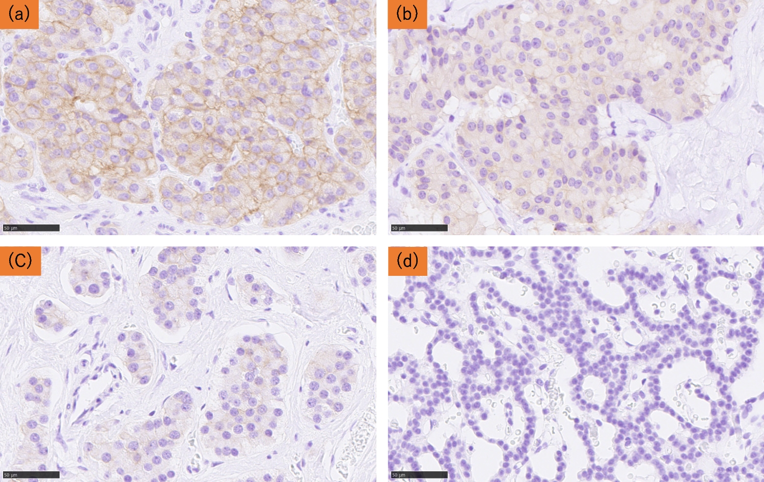 In epithelial NENs, PanNETs and duodenal NETs show relatively high prevalence of GLP- 1R expression (34% and 53%, respectively, Table 1). In non-epithelial NENs, Paraganglioma/Pheochromocytoma also showed GLP- 1R expression (13%, Table 1). Previous studies showed the expression of GLP- 1R in insulinomas and paraganglioma/pheochromocytomas, but not in pituitary adenomas and pulmonary small cell carcinomas [20, 21] and the results of these previous studies are comparable with those of this study. Previous studies have observed that GLP- 1R expression was detected by autoradiography in normal tissues such as islets of the pancreas and Brunner’s glands of the duodenum [20, 22]. PanNETs and duodenal NETs often arise from neuroendocrine cells in the islets and Brunner’s glands, respectively. Therefore, we hypothesized that the expression in these tumors results from the expression native to their normal counterparts. GLP- 1R expression was also detected in 2/26 cases (8%; Table 1) of MTCs. Previous reports have demonstrated that 2/10 (20%) sporadic MTC cases and 0/10 (0%) MEN2 MTCs exhibit GLP- 1R expression [20, 23], which is consistent with our results. In addition, a previous study showed that C cells in human thyroid tissue do not express GLP- 1R [23]. MTCs showed hardly any GLP- 1R expression, possibly because MTCs might inherit C cells that do not show GLP- 1R expression. A larger sample of such cases is required for further clarification.