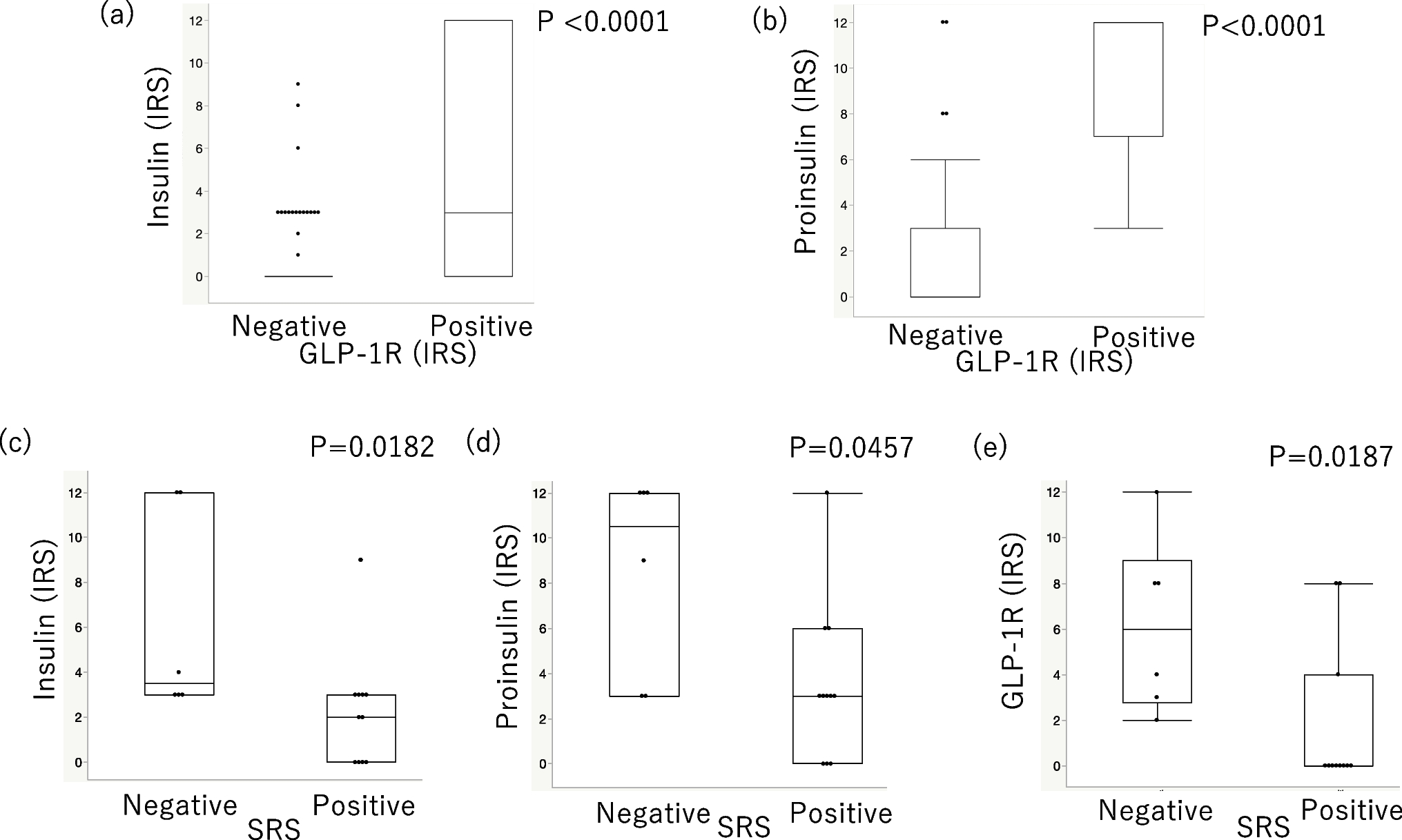 Box-plot graphs comparing immunoreactivity of GLP- 1R, insulin, proinsulin, and the result of SRS in PanNETs, GLP- 1R positive cases showed higher expression of (a) insulin (p < 0.0001) and (b) proinsulin (p < 0.0001) than GLP- 1R negative cases. SRS positive cases showed lower expression of (c) insulin (p = 0.0182), (d) proinsulin (p = 0.0457), and (e) GLP- 1R (p = 0.0187) than SRS negative cases