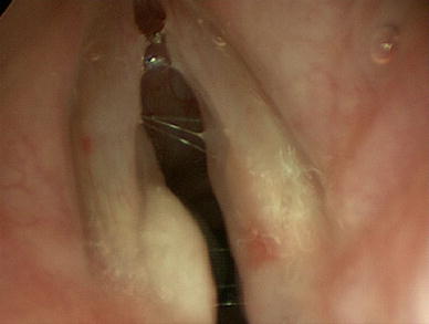 Neck examination was normal. Endoscopic results of the initial examination are displayed (Fig. 1), showing a pale lesion in the left posterior vocal cord. Vocal cord movement, as displayed by video stroboscopy, was symmetrical and normal. Nevertheless, there was cause for concern that this could represent malignancy so we proceeded with further investigations.