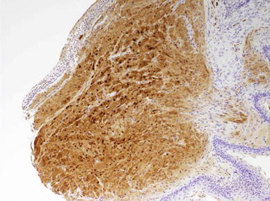 Histologically, the presence of overlying pseudoepitheliomatous hyperplasia and occasional normal mitosis can provide confusion with squamous cell carcinoma; however, lack of nuclear hyperplasia or pleomorphisms, and presence of granular cells can differentiate this condition [4]. Granular cell tumours classically have polygonal or elongated cells with eosinophilic granules, small nuclei, and absent mitosis [6]. Positive S100 staining for fibrovascular stroma separating these cells can help to confirm this diagnosis (Fig. 3), as can periodic acid schiff staining for cellular lysosomes present within granular cells [4].