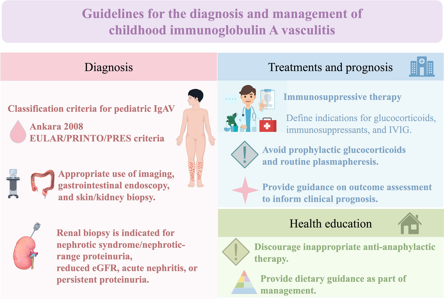 In total, five recommendations for diagnosis, six for treatment, one for prognosis, and two for health education for pediatric IgAV were accepted. Diagnostic recommendations included the use of the European Alliance of Associations for Rheumatology/Pediatric Rheumatology International Trials Organization/Pediatric Rheumatology European Society-endorsed Ankara 2008 classification criteria for IgAV diagnosis. In addition, appropriate use of imaging, gastrointestinal endoscopy, skin biopsy, and kidney biopsy are recommended. Kidney biopsy is recommended for children with IgAV presenting with nephrotic syndrome/nephrotic-range proteinuria, reduced estimated glomerular filtration rate, acute nephritis syndrome, or persistent moderated/mild proteinuria. Treatment recommendations involved indications for glucocorticoid use, immunosuppressant use, and intravenous immunoglobulin use. It also addressed the inappropriate use of prophylactic glucocorticoid treatment and recommended against routine employment of plasmapheresis. Health education placed emphasis on the inappropriate use of anti-anaphylactic treatment and proffers dietary suggestions.