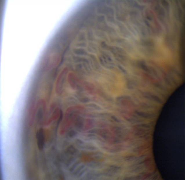 RA: geschlängelte AV-Irismalformation, vom Limbus bis zum Pupillarsaum ziehend bei 10 Uhr