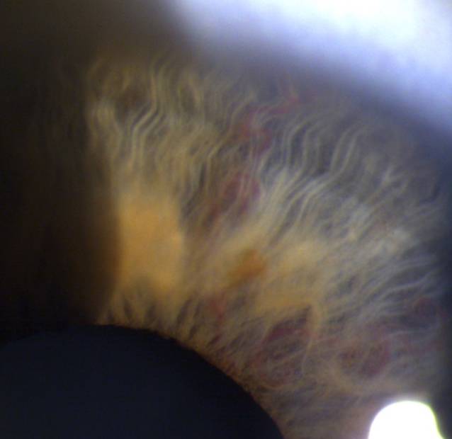 Eine 46-jährige Patientin stellte sich zur Abklärung in unserer Klinik vor, da dem niedergelassenen Augenarzt bei einer Routinekontrolle aufgrund von Myopie erstmalig am rechten Auge temporal eine verstärkte Gefäßzeichnung/Gefäßanomalie der Iris aufgefallen war. Eine Sehverschlechterung oder andere Beschwerden habe sie nicht. Allergien seien gegen Pferdehaar, Hausstaub und Gräser bekannt. Die Allgemeinanamnese und die Familienanamnese bezüglich Gefäßanomalien waren blande.