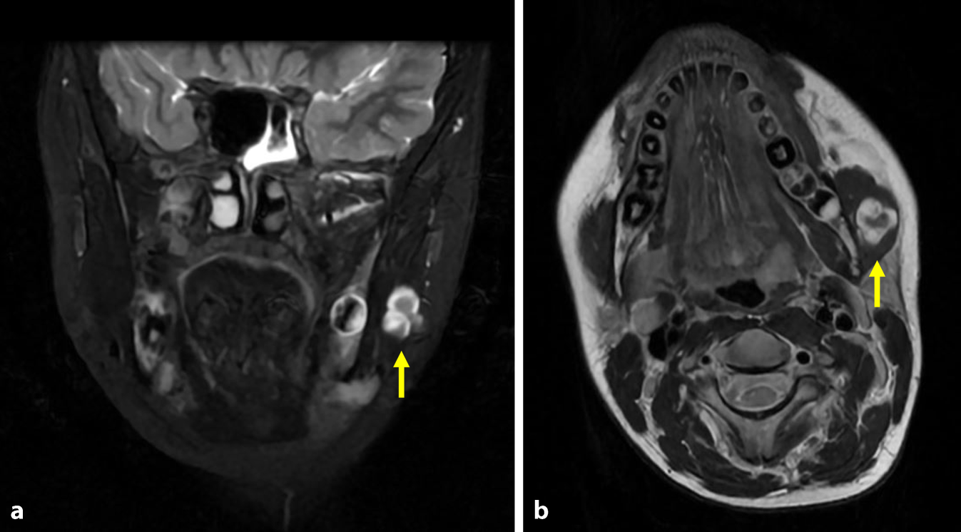Eine darauffolgende MRT-Bildgebung des Kopf-Hals-Bereichs zeigte eine im Seitenvergleich prominente, zystisch imponierende Struktur im M. masseter links. In T2-Wichtung waren hypointense Binnenstrukturen erkennbar (Abb. 1). Zusätzlich zeigten sich vergrößerte Lymphknoten ohne Hinweise auf Abszedierung oder Einschmelzung. Seitens der Kollegen der Radiologie wurde eine sonographische Korrelation empfohlen.