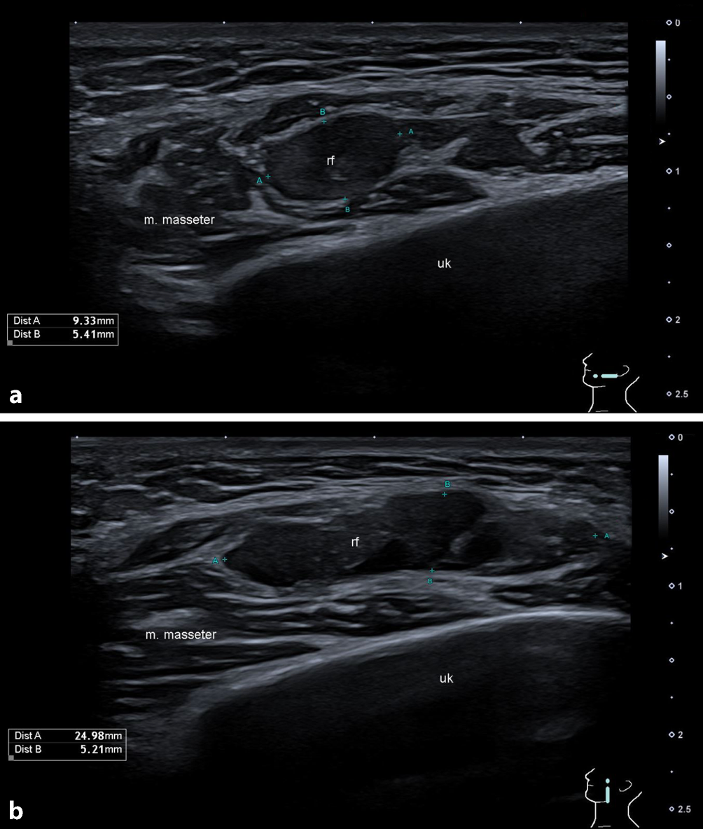 B‑Bild-Sonographie des Kopfes. a transversal und b longitudinal. rf Raumforderung, uk Unterkiefer, m.masseter M. masseter