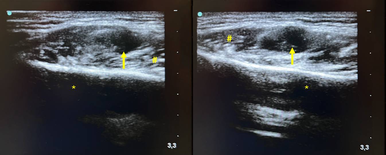 Die sonographische Kontrolle bestätigte eine 24,9 × 9,2 × 5,4 mm große, avaskuläre, inhomogene, zystische Raumforderung im linken M. masseter. Keine dorsale Schallverstärkung oder Schallschatten (Abb. 2). Zusätzlich fanden sich in den Leveln Ib und IIa links vergrößerte ovale, hilär vaskularisierte, scharf begrenzte Lymphknoten ohne Malignitätszeichen. Ein ergänzendes Orthopantomogramm (OPG) ergab keine Hinweise auf röntgendichte Fremdkörper, dentogene Foci oder anderweitige knöcherne Pathologien, die die klinischen Beschwerden erklären konnten.