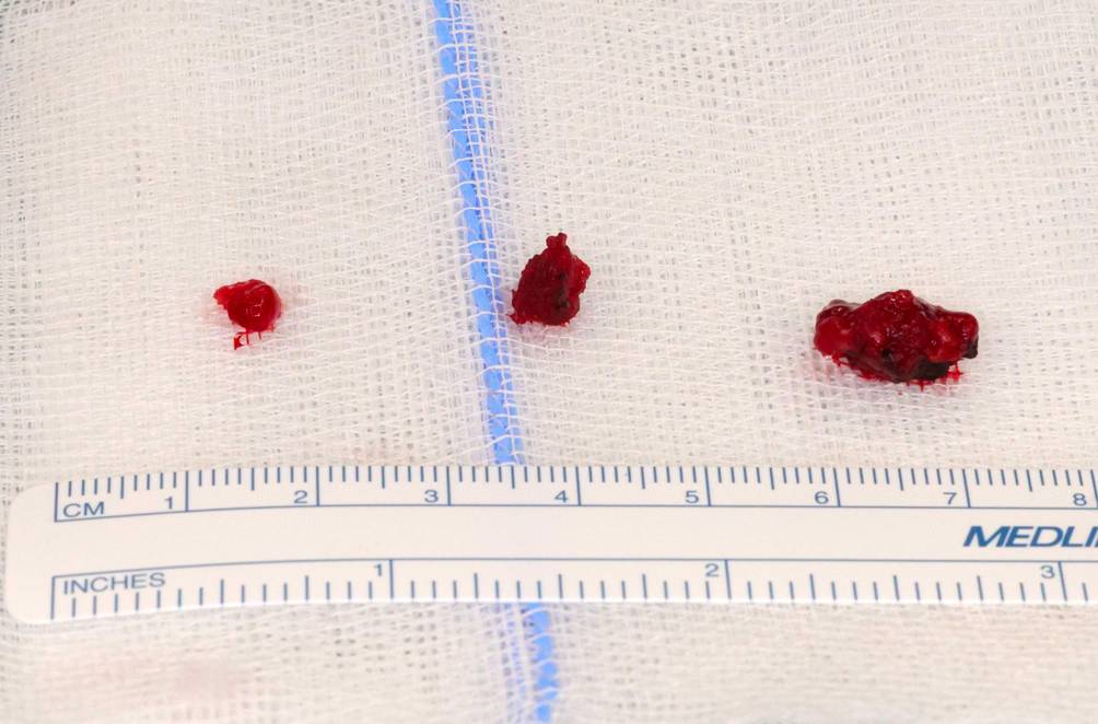 Nach zunächst erfolglosem konservativen Therapieversuch wurde die Indikation zur vollständigen chirurgischen Exstirpation der Raumforderung gestellt. Der Eingriff wurde in Intubationsnarkose über einen intraoralen Zugang durchgeführt. Die Inzision erfolgte in üblicher Weise entlang der ventralen Begrenzung des Ramus mandibulae, ossär krestal vom Processus coronoideus bis zur Regio 37. Die Präparation erfolgte unter konsequenter digitaler Palpationskontrolle. Mithilfe kontinuierlicher intraoperativer Sonographie konnte die Läsion in der Tiefe des linken M. masseter lokalisiert und unter spitz-stumpfer Präparation sukzessive freigelegt werden (Abb. 3 und 4). Makroskopisch war die Raumforderung schwer von der umgebenden Muskulatur abgrenzbar. Nach vollständiger Mobilisation gelang die Entfernung der Raumforderung in toto. Sämtliche Proben wurden zur histopathologischen Aufarbeitung eingesandt (Abb. 5). Nach sorgfältiger Hämostase erfolgte ein spannungsfreier, mehrschichtiger speicheldichter Wundverschluss mit resorbierbarem Nahtmaterial. Abschließend wurde ein Kopfdruckverband angelegt.