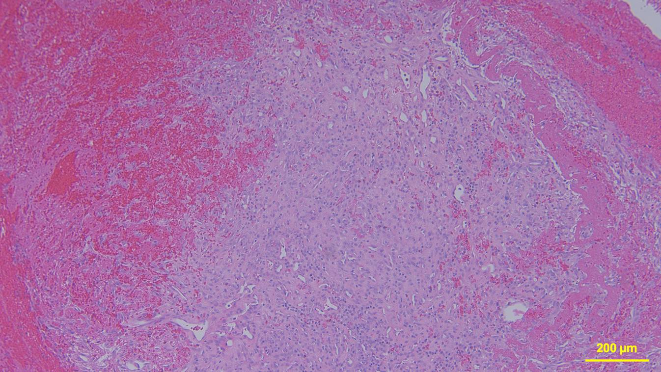 Die histopathologische Aufarbeitung ergab: Fibröses Bindegewebe mit einliegender, leicht atropher Skelettmuskulatur. Daneben flächige Erythrozytenansammlungen durchsetzt mit Fibrin und korpuskulären Blutbestandteilen. Angrenzend knotiges Granulationsgewebe mit Kapillar- und Fibroblastenproliferaten sowie Histiozyten (Abb. 6). Kein wesentlicher florider inflammatorischer Prozess. Keine atypischen Zellinfiltrate. In der histologischen Gesamtbeurteilung ergibt sich eine atrophe Skelettmuskulatur mit älteren Einblutungen und einer assoziierten chronisch-resorptiven Entzündungsreaktion.