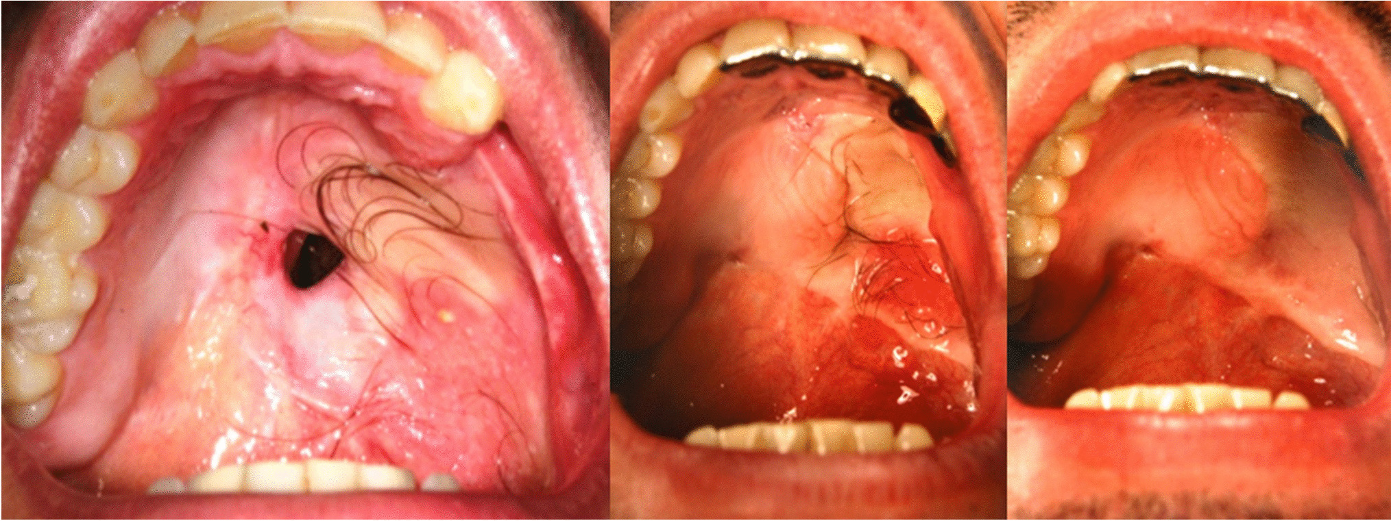 Left to right: clinical imaging showing the progressive reduction of intraoral hair postlaser treatment. Please note that defect was repaired by the maxillofacial surgery department during the early course of the treatment