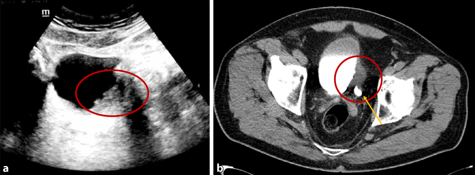 a Ultraschallbild der Harnblase mit Verdacht auf Harnblasentumor an der linken Trigonalleiste. b CT-Urogram des Patienten vor transurethraler Resektion von Harnblase (TURB) mit deutlicher Wandverdickung im Bereich des rechten Ostiums und erweitertem Harnleiter präostial (Pfeil)