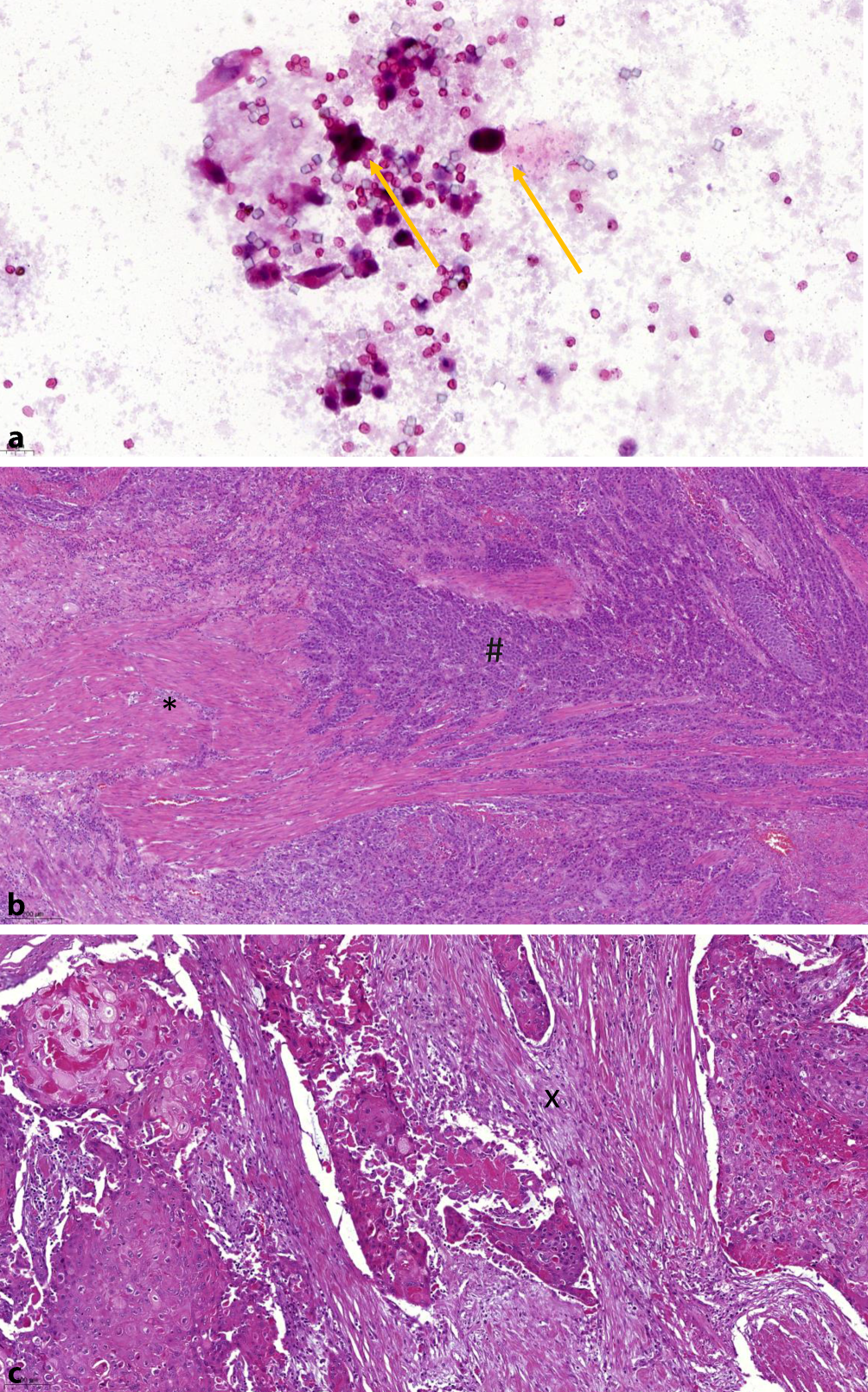 a Urinzytologie mit eindeutig dysplastischen Kernen (gelbe Pfeile) – hoch suspekt auf das Vorliegen eines High-grade-Urothelkarzinoms. b Muskelinvasives Harnblasenkarzinom (Raute) mit Infiltration der Lamina muscularis der Harnblase (Sternchen). c Harnblasenkarzinom mit plattenepithelialer Differenzierung (x). (Mit Bestem Dank an Dr. Markus Eckstein, Erlangen)