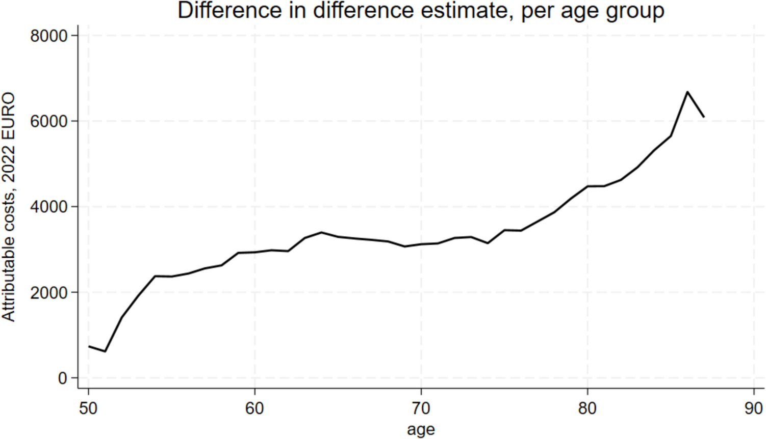 Consumption of municipal health and social care, inter alia, home help and home nursing, is registered in Statistics Denmark as hours provided per week. These hours were valued using average wages for relevant groups of healthcare professionals for care and treatment, and unskilled labour for home help. Nursing homes were valued using a monthly tariff of €4788 (2022 price level), covering care and other services provided by the municipality but not the rent which is paid by the residents themselves.