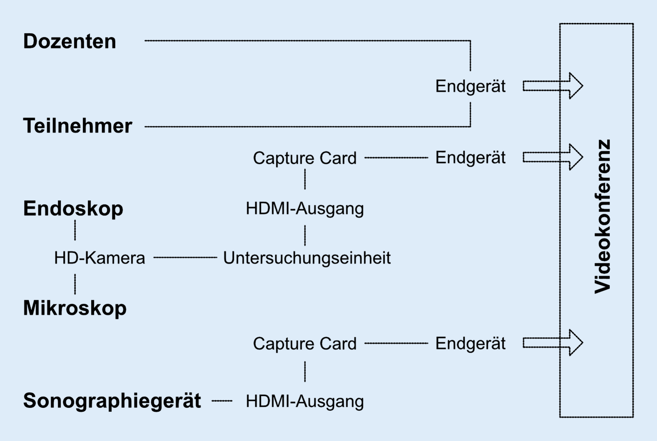 Zur digitalen Vernetzung wurde ein kostengünstiges, einfach zu installierendes Übertragungssystem rein zu Lehrzwecken ohne Zulassung für die Patientenversorgung etabliert. Basierend auf sog. Capture Cards (Elgato Game Capture HD60 S+, Fa. Corsair Gaming Inc., Milpitas/CA, USA) wurden die HDMI-Bildausgänge des Sonographiegeräts (Logiq P9, Fa. GE Healthcare GmbH, Solingen, Deutschland) und der Endoskop‑/Mikroskopkamera in Eingangssignale der High-Definition(HD)-Kamera (PES Pilot HD Pro, Fa. Happersberger Otopront GmbH, Hohenstein, Deutschland) transformiert und über das so verbundene Notebook das Bild in Zoom dargestellt (Abb. 1).