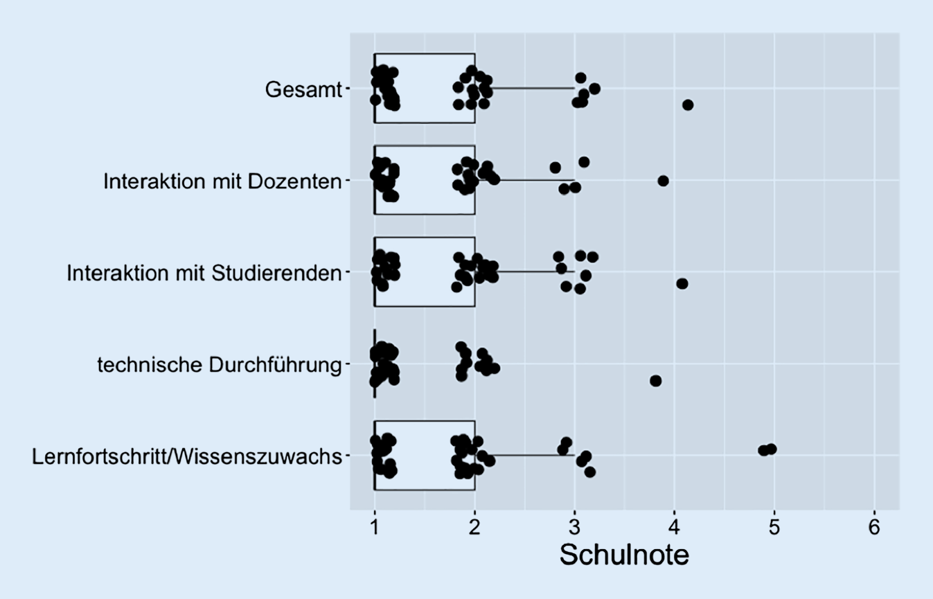 Die Evaluation erfolgte freiwillig und anonym über einen digitalen Fragebogen mit 27 Items über Microsoft Forms (Fa. Microsoft Corporation, Redmond/WA, USA). Studierende wurden über den Zweck der Datenerhebung informiert und gaben ihr Einverständnis zur weiteren Verwendung der Daten. Die Auswertung erfolgt mit Microsoft Excel (Microsoft Corporation) und R for Statistical Computing (https://www.r-project.org).