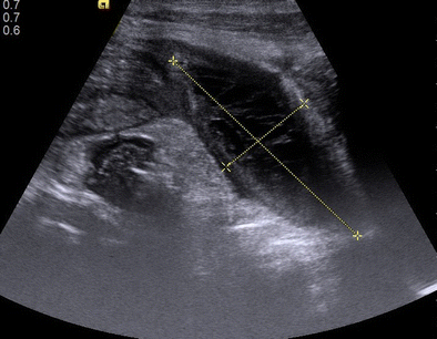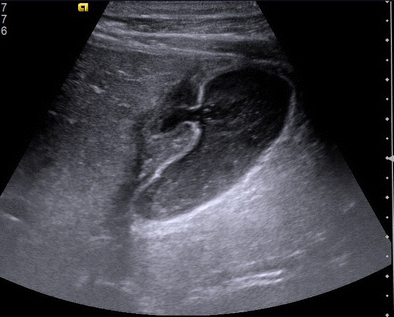 The “hole sign” of gallbladder represents direct visualization of a perforation in the gallbladder [1]. Gallbladder perforation, a rare and dangerous complication of acute cholecystitis, occurs most commonly in the fundus, owing to poor blood supply. Gallbladder perforation may develop as early as 2 days as late as several weeks after the onset of the symptoms. Gallbladder perforation may occur in calculous as well as acalculous gallbladders. Identification by imaging is essential because of the high morbidity and mortality. Demonstration of flow between the lumen of the gallbladder and pericholecystic abscess across gallbladder wall defect on color Doppler and identification of calculi within the perihepatic collection are the two other signs described with gallbladder perforation [1]. Ultrasonography of this patient with acalculous cholecystitis showed the “hole sign” in the superior wall of the sludge filled gallbladder with a pericholecystic collection along the medial aspect of the gallbladder (Figs. 1 and 2). Ultrasonic signs, especially the “hole sign” helps in unequivocally establishing the diagnosis of gallbladder perforation [2]. This patient underwent emergency cholecystectomy and responded well to treatment.