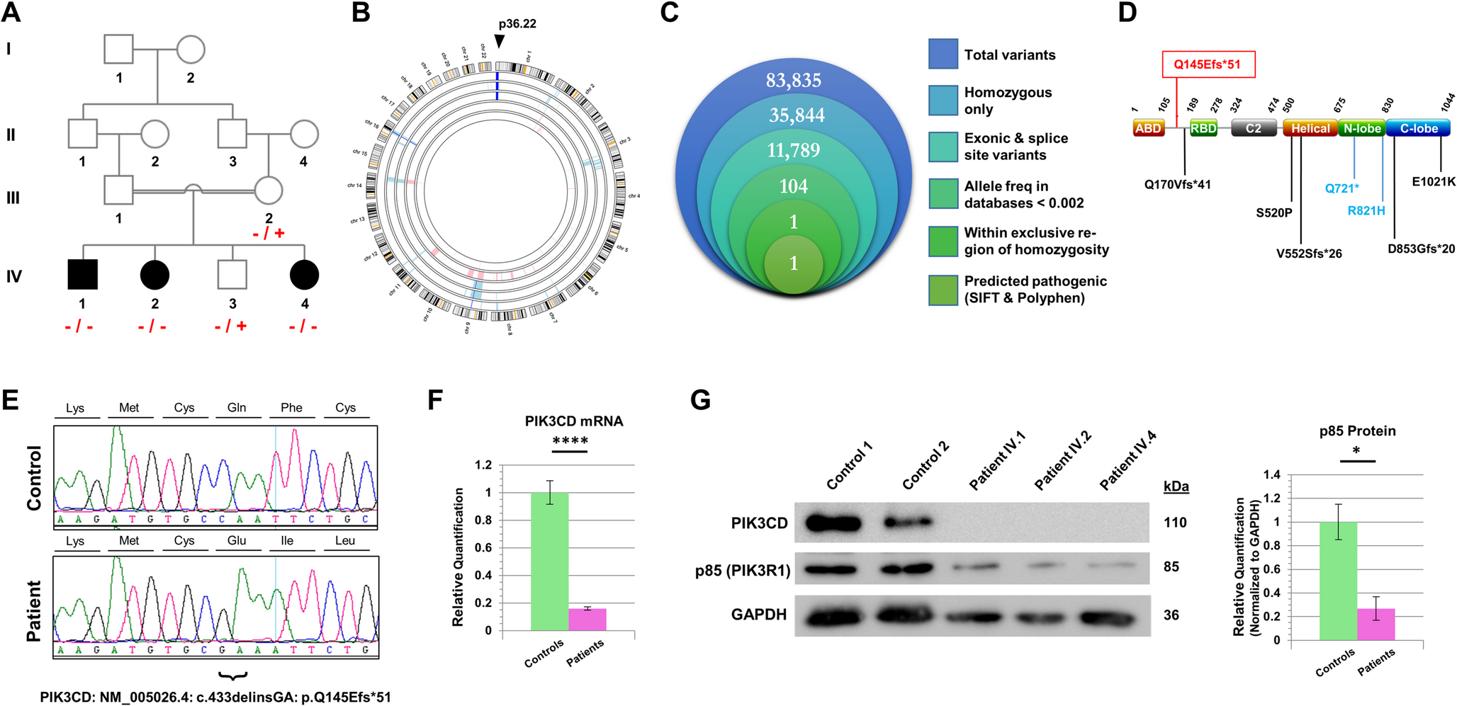 Here we describe the clinical, molecular and cellular aspects of a family that segregates a null phenotype of PIK3CD. In leukocytes PI3Kδ, composed of a p85α and p110δ heterodimer, acts upon PIP2 to generate PIP3, an essential mediator of cellular growth and survival. Key downstream effectors of PI3Kδ include Akt, which activates mTOR and thereby facilitates glucolysis and cellular growth, and IL-2 inducible T cell kinase (ITK) in T cells and Bruton tyrosine kinase (BTK) in B cells [