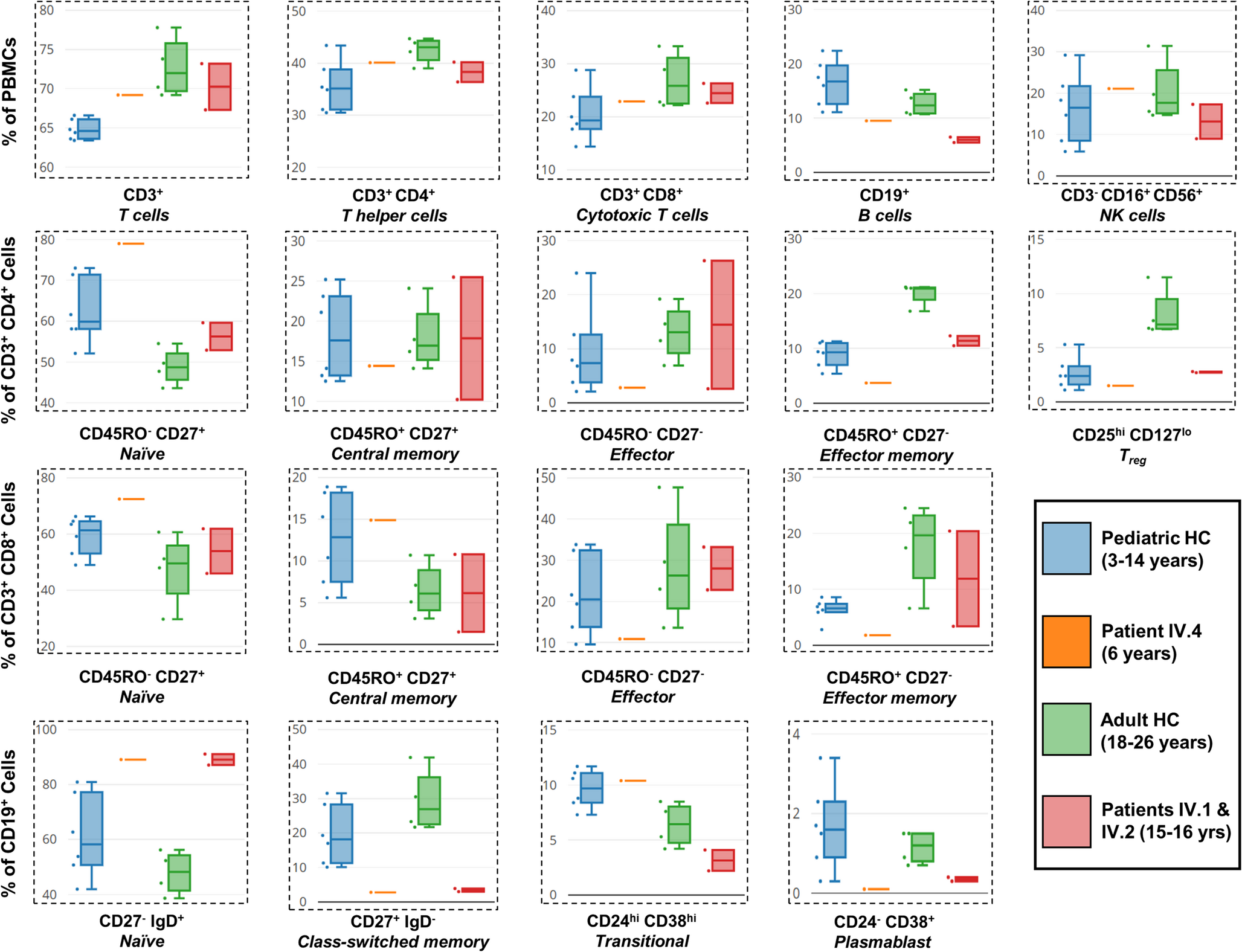 20], including an almost total absence of CD19 + cells in blood, and of B lineage (including pro-B) cells in bone marrow. In line with these reports, immune phenotyping of our patients also revealed low B cell ratio as well as abnormally high naïve, and abnormally low class-switched, CD19 + percentages across all three patients. These findings were also reflected in our in vitro work, which revealed that patients’ total CD19 + and enriched naïve B cells exhibited deficient responses to T cell-dependent stimulation, including weak proliferation activity and poor class-switching. CD19 + cells also displayed increased apoptosis.