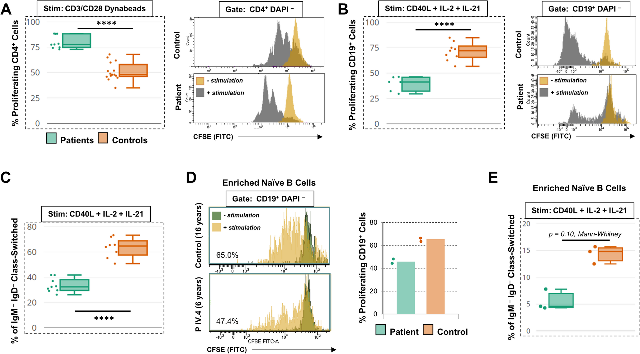 For the carboxyfluorescein 6 succinimidyl ester (CFSE) proliferation assay, thawed PBMCs were rested for 2 h in complete medium. Cells were then stained with 1 µM CFSE (BD) at 37 degrees for 15 min, washed extensively in complete medium, then seeded in a U-bottom 96-well plate at a density of 1 × 106 cells/ml. For T cell proliferation, CFSE-labelled PBMCs were incubated in the presence or absence of Dynabeads Human T-Activator CD3/CD28 (Thermo Fisher) for 3 days and analyzed by FACS. Experiments on total CD19 + cells were conducted as part of a mixed PBMC population, while those involving enriched naïve B cells were performed on the CD19 + CD27- IgD + subset after processing through a BD FACSMelody Cell Sorter. Cells were stained with CFSE (for the proliferation assay) or not, then treated with CD40L (MEGACD40L, Enzo Life Sciences, Farmingdale, NY) supplemented with IL-2 (202-IL-010) and IL-21 (8879-IL-050) (both R&D Systems, Minneapolis, MN) for the indicated durations. Fluorescent antibodies used for analysis included anti-CD4-APC, anti-CD27-PE, anti-IgM-APC (all BD), anti-IgD-FITC (348206, Biolegend) and anti-CD19-PE-Cy7 (25-0199-42, Thermo Fisher). After addition of 4′,6-diamidino-2-phenylindole (DAPI) for live/dead screening, cells were analyzed on an LSR II flow cytometer (BD) with lymphocyte proliferation assessed as a measure of CFSE loss. DAPI/Annexin V cellular profiling was performed using Annexin V-Alexa Fluor 488 (V13241, Invitrogen).