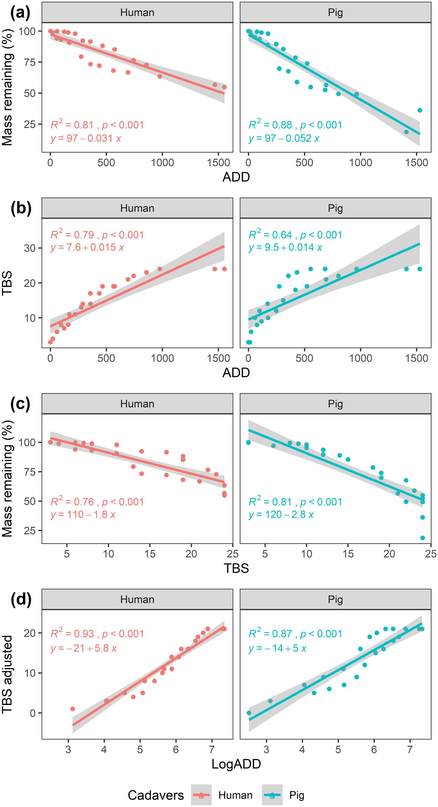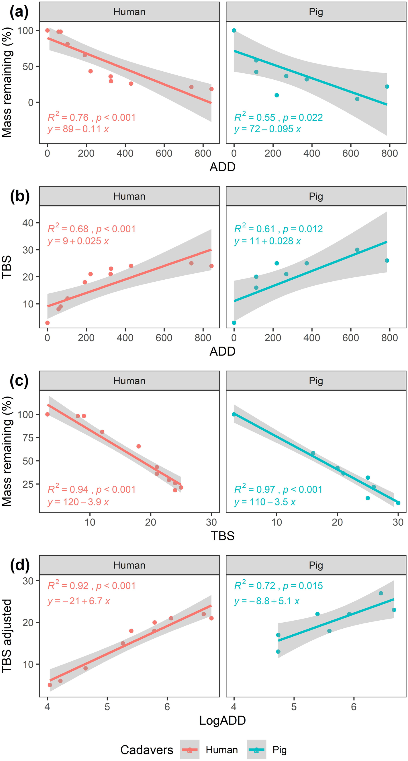 Mass loss was found to be significantly negatively correlated with ADD for both humans and pigs (Fig. 2a). Overall, pigs lost more mass than humans, with pigs reaching around 75% mass loss while humans lost no more than 50% of their mass. TBS was also found to be significantly positively correlated with ADD for humans and pigs (Fig. 2b). Unlike the humans, TBS values rose rapidly on pigs, reaching above 20 TBS before plateauing. Despite the more rapid rate of TBS increase on pigs, humans also eventually plateaued at the maximum recorded TBS of 24. When comparing mass loss to TBS, humans and pigs were found to be significantly negatively correlated (Fig. 2c). Mass loss occurred at a faster rate in pigs with around 25% of the mass loss occurring at 24 TBS. The adjusted TBS models were also positively significantly correlated with ADD with high R-squared values (Fig. 2d). In general, pigs displayed more unexplained variation in the data, with lower R-squared values and more measurements lying outside the SE range compared with humans.