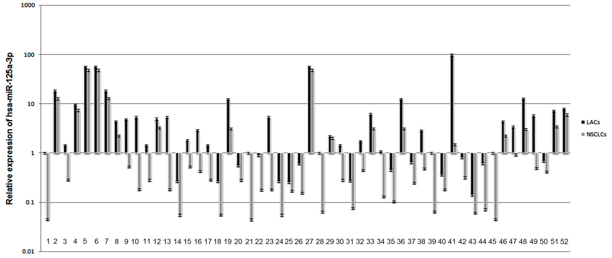 Relative expression of hsa-miR-125a-3p in lung cancer tissues. The relative expression of hsa-miR-125a-3p decreased in 52 NSCLCs in comparison to corresponding LACs. The data are representative of three independent experiments, and the relative expression values were calculated using the equation RQ = 2-ΔΔCt.