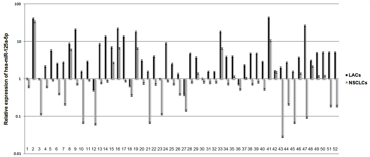 Relative expression of hsa-miR-125a-5p in lung cancer tissues. The relative expression of hsa-miR-125a-5p decreased in 52 NSCLCs in comparison to corresponding LACs. The results are representative of three independent experiments, and the relative expression values were calculated using the equation RQ = 2-ΔΔCt.